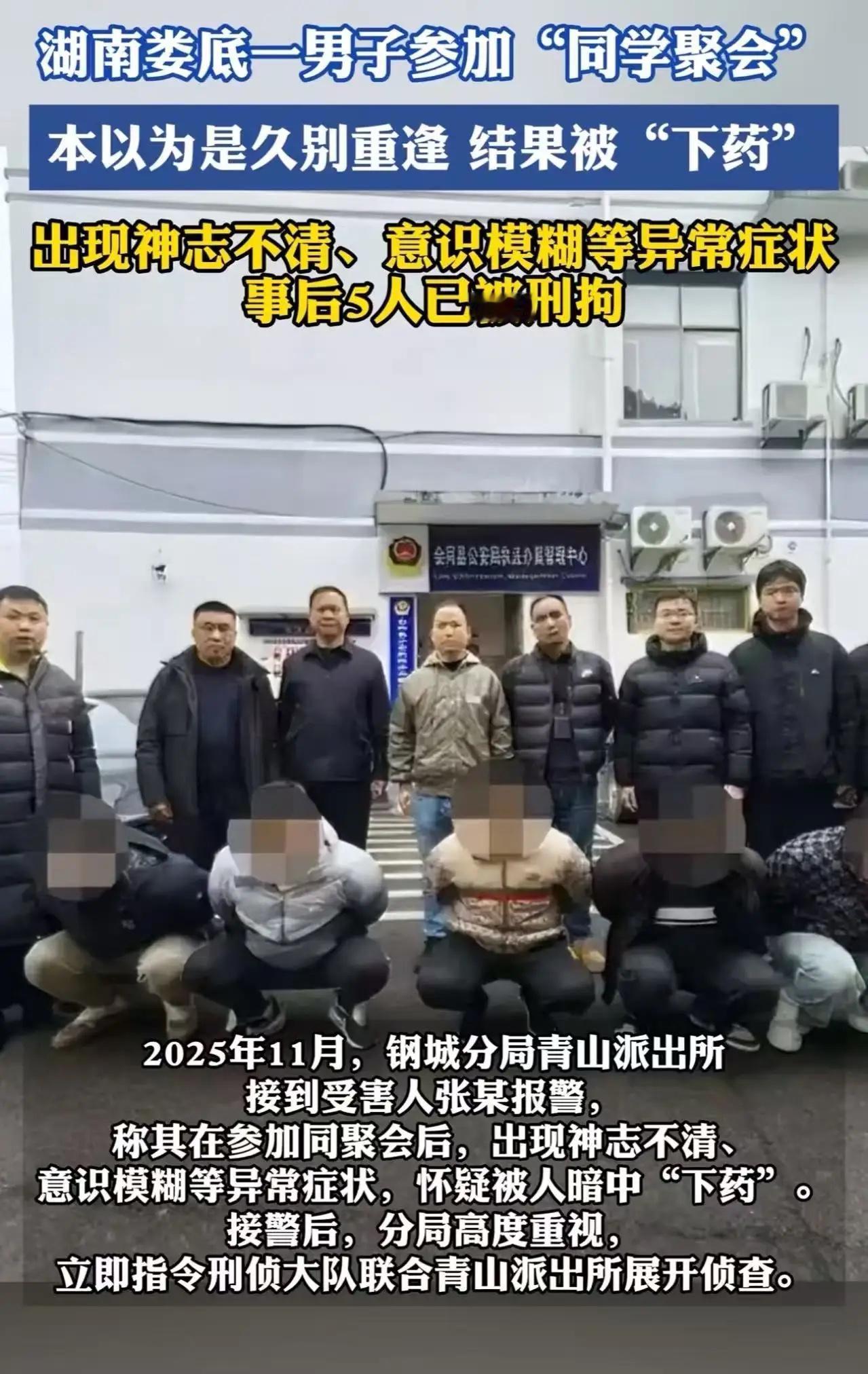 “8年前我朋友就是这样输掉12万的!”湖南男子参加同学聚会被人下药设局,呕吐离场捡回一条命!警方通报:5人已被刑拘 那通电话来得突然,也让张某心里一热。 “老张!我是林子啊,高中睡你上铺那个!”2025年11月的一个周末,湖南娄底的张某接到多年未见的老同学的电话。对方说刚好和几个兄弟来这边玩,想约着聚聚。十几年没见了,能重逢不容易,张某没多想,爽快答应了。 晚上,市区一家私房菜馆包厢里,酒菜满桌,气氛热络。林某带着四个朋友早早在场,见了面又是拍肩又是敬酒,一口一个“兄弟”,好像时光从未走远。 酒过三巡,服务员端上一壶“特调养生酒”。林某接过来,亲自给张某满上——谁都没留意,他倒酒的时候,手腕多抖了一下。 那多出来的一勺,不是酒,是掺了冰毒的迷魂汤。 几杯下肚,张某开始不对劲了。头晕目眩,视线模糊,耳边声音忽远忽近。他强撑着站起来:“不行了,我得先回去。”众人嘴上挽留,心里却在暗喜:药效来了,鱼要上钩了。 按他们原计划,等张某神志不清了,就带到隔壁棋牌室“玩几把小的”。借着药劲儿配合出千手段,一晚上就能把他积蓄榨干——这就是所谓的“组局杀猪”。 可谁也没想到,张某刚出饭店门,胃里翻江倒海,哇地吐了一地。他直接打车回家倒头昏睡,赌局就这么黄了。 第二天醒来,张某越想越不对:我平时千杯不醉,怎么两杯就断片了?再看手机,好几个林某的未接来电,语气急得很:“老张,昨晚咋走了?大伙儿还等你回来玩呢!” 一股凉意从后背窜上来。张某报警了。 警方一查,结果让人后背发凉——张某血液里,检出了冰毒成分。原来,这伙人早在怀化就密谋好了,专门挑“有存款、讲义气、好面子”的老同学下手,先用感情牌把人约出来,再在酒里下药,等人迷糊了再设赌局骗钱。2月12日,警方在怀化把这5个人一锅端,目前5人均因涉嫌投放毒品、诈骗等多项罪名被刑事拘留。 这事传到网上,网友炸了锅。 “8年前我朋友就被半生不熟的老乡这样搞过!一晚上输掉12万,老婆差点离婚。套路一模一样——先喝酒,再打牌,最后人财两空!” “所以我过年回老家,故意开破车、穿旧衣、抽5块钱的烟,见人就说‘今年亏惨了’。没人找我打牌!装穷,是防骗术。” “能搞到冰毒还敢给人喝?这不是普通赌博,是刑事重罪!牢底坐穿都算轻的。” “最可怕的是,他们利用的是‘信任’——你防陌生人,但防不了喊你‘老张’的人。” 还有人一针见血:“从毕业到现在一次同学会都没有参加的举手。现在的同学聚会变味了,滂臭!” 这个案子最让人胆寒的地方在哪?不是下药,不是设赌,而是这帮人精准利用了中国人最珍视的“情义”作为作案工具。在熟人社会里,我们对“老同学”“老乡”天然降低戒备。一句“都是自己人”,就能让你放下警惕;一杯“感情酒”,就能让你喝下毒药。而这些骗子,太懂这个了。他们不抢不偷,用温情裹着刀子,用回忆麻痹你,用“兄弟”俩字撬开你的钱包。 更可怕的是啥?如果张某没走,他不仅钱没了,还会在不知情的情况下“被动吸毒”,沾上案底。考公?参军?全完了。这种跳进黄河也洗不清的脏水,足以毁掉一个普通家庭的所有希望。 那怎么办?有网友给出几条保命建议:别把“老同学”仨字太当回事,那些十年八年不联系、一上来就组局打牌还带陌生人的,直接划入高危区;脸皮要厚,学会拒绝,有人逼酒就说“吃了头孢”“在备孕”,如果对方还不依不饶甚至冷嘲热讽,直接翻脸走人;最重要的,是知道“被动涉毒”的代价——给你下药的人,触犯的是《刑法》第三百五十三条欺骗他人吸毒罪,起步三年,情节严重的七年以上,还可能涉及诈骗罪、开设赌场罪,数罪并罚够他们把牢底坐穿。遇到这种事,别怕丢人,第一时间保留证据,赶紧去医院验血报警。 张某这次能逃过一劫,表面看是运气,实际上是靠身体“报警”捡回一条命。可运气这东西,能用几回? 我们总说社会复杂,可真正复杂的不是社会,是人心。愿所有重逢都真诚,所有聚会都平安。也请记住:真正的老同学,不会让你输钱;真正的兄弟,更不会让你喝下不明液体。若有人以“情义”之名诱你入局,请果断转身——因为有些“局”,进去就再也出不来。 今日话题:多年未见的老同学组局,桌上还有陌生面孔,对方热情劝酒说“不喝不给面子”,你会怎么办?欢迎在评论区分享你的“拒酒神操作”! 来源:综合娄底钢城公安通报、三湘都市报报道