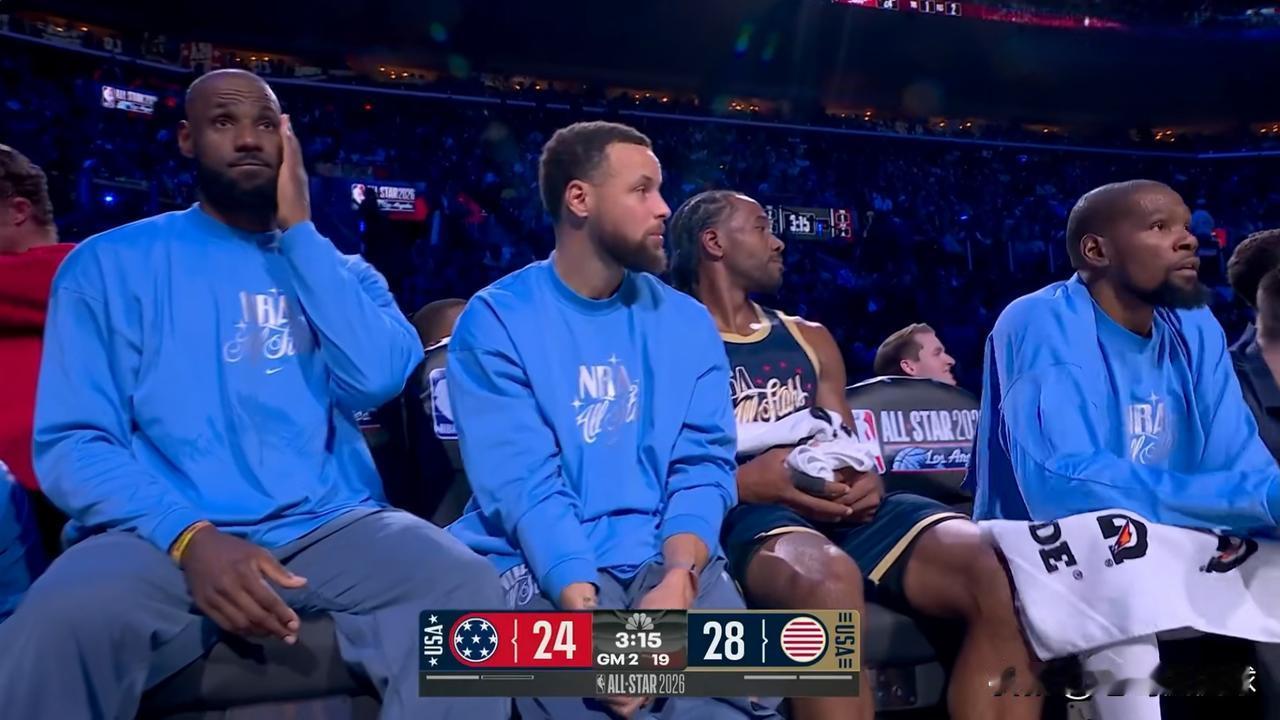 在今天进行的全明星正赛中,发生了特别让人动容的一幕。当时美国条纹队和美国星队的比赛进行到了3分15秒,美国条纹队以28:24领先对手,这个时候转播镜头给到了美国条纹队的替补席,只见四大巨星詹姆斯、库里、伦纳德和杜兰特并排而坐,场面看起来非常的温馨感人,这一幕让人特别的动容,这是多少人的青春年华啊,随着他们的老去,NBA即将进入到了一个新时代。