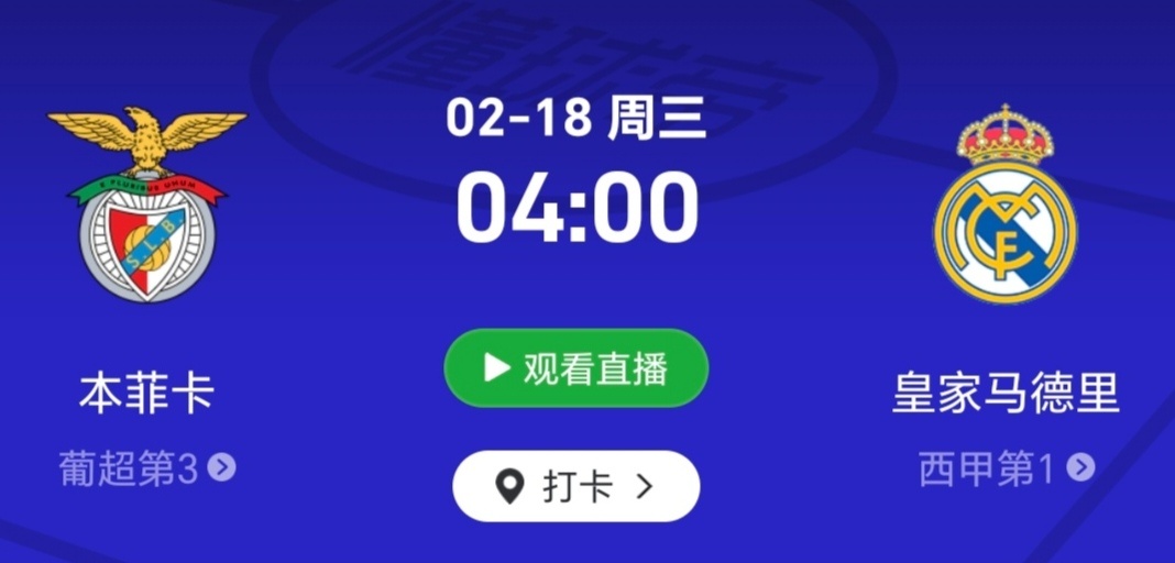 本菲卡vs皇马欧冠联赛穆里尼奥魔力鸟再战银河战舰! 欧冠联赛阶段最后一轮,穆里尼奥率本菲卡击败他的徒弟阿韦洛亚执教的皇马。本菲卡补时阶段压哨破门,惊险晋级欧冠附加赛。皇马被迫掉入欧冠附加赛。皇马在欧冠附加赛中又要对阵本菲卡,两队将上演精彩续集——2月18日4点,附加赛首回合,本菲卡主场对皇马。