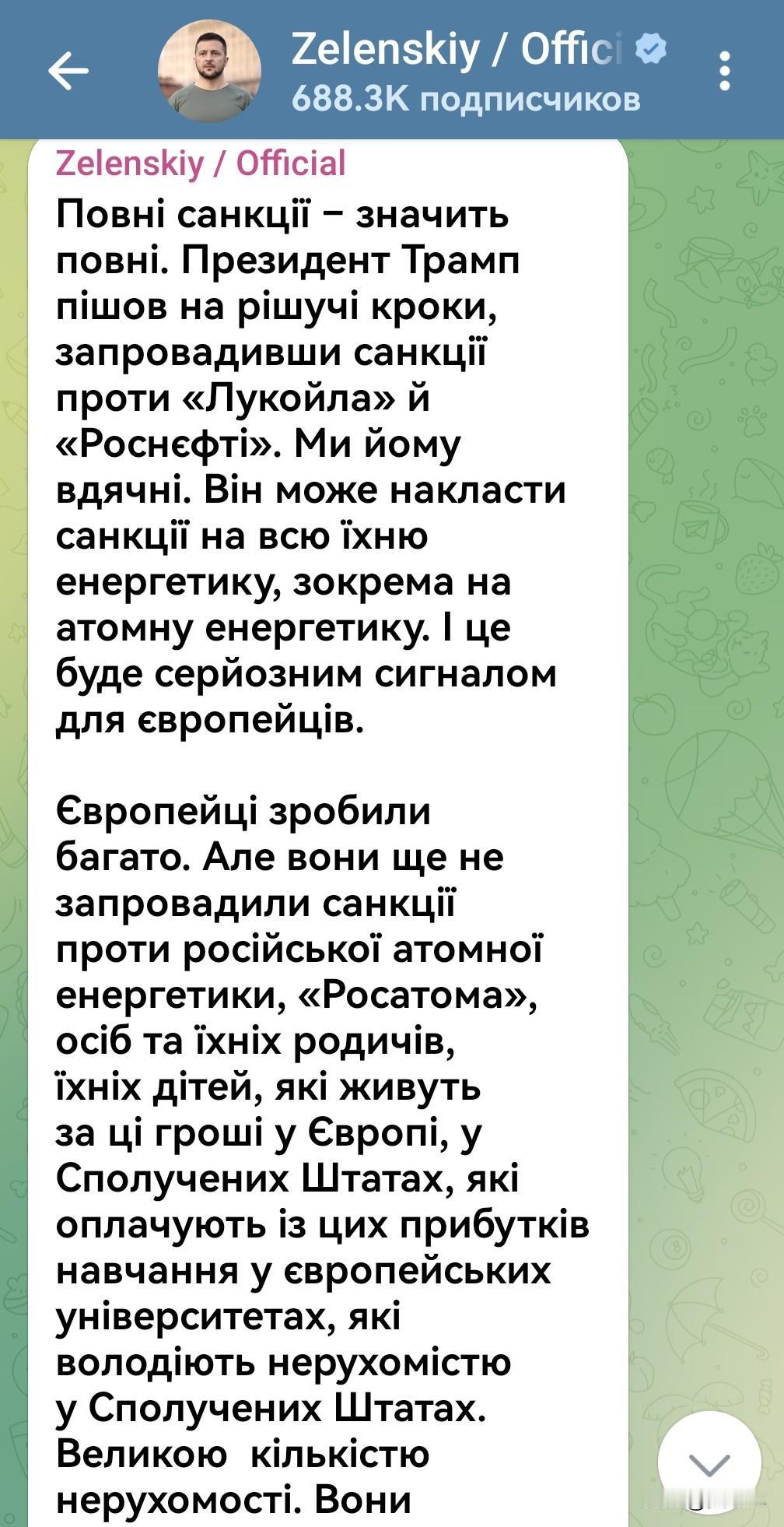【这的确是泽连斯基写的:不怕得罪欧洲人?】 2月16日,泽连斯基在电报频道发文,建议美国将制裁扩大到核能领域,以对欧洲人发出严肃的信号。全文如下: “全面制裁——就意味着彻底。特朗普总统迈出了果断的一步,对卢克石油和俄油实施了制裁。我们对此表示感谢。他可以将其制裁扩大至俄罗斯整个能源领域,包括核能领域。这将对欧洲人发出一个严肃的信号。 欧洲人已经做了很多。但他们尚未对俄罗斯核能领域、对俄原子能公司、对那些人及其亲属、对其子女实施制裁。这些人用那些钱生活在欧洲、生活在美国,用那些收益支付在欧洲大学的学费,在美国拥有房产——拥有大量房产。他们资助着子女和亲属在世界各地生活。 滚回俄罗斯去吧。回到你们的家乡。你们在美国不尊重任何人。你们不尊重规则。你们不尊重民主。你们不尊重乌克兰或欧洲。滚回你们的家乡去。”
