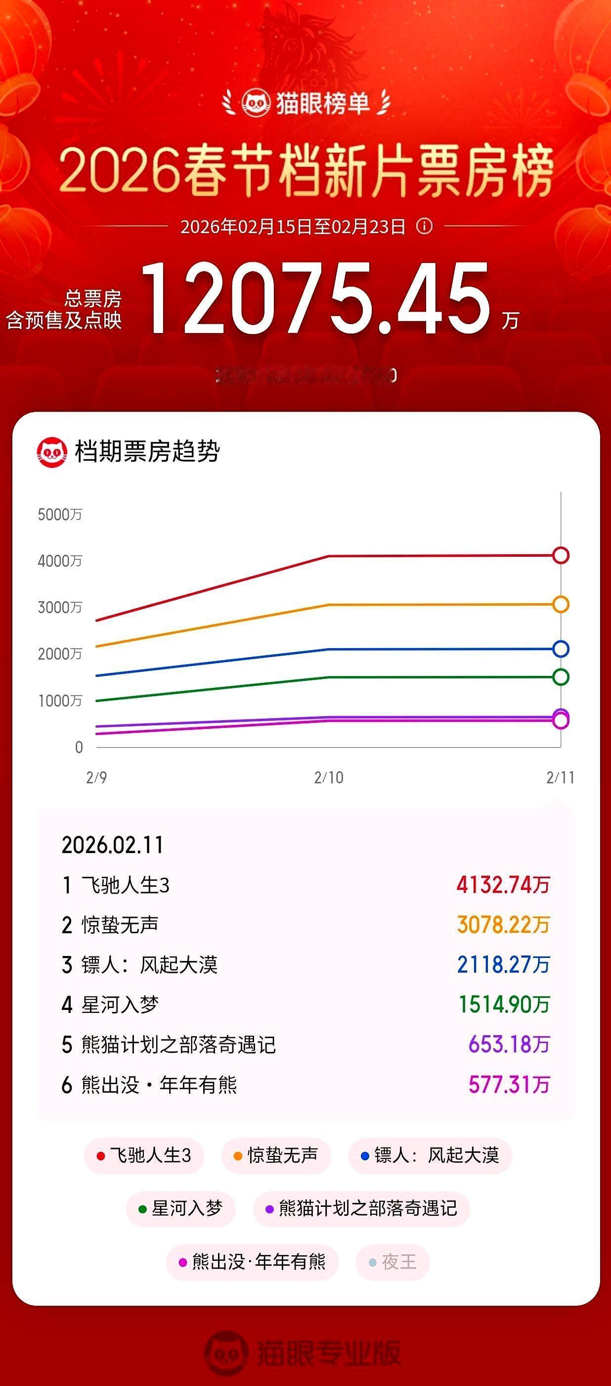 春节档预售破4.2亿,但只有一部电影在狂奔。 《飞驰人生3》预售已超1.8亿,预测票房30亿+。沈腾加韩寒,把油门焊死在赛道上。其他片子呢?哑火了。张艺谋带着易烊千玺、朱一龙拍的国安谍战片《惊蛰无声》,预售八千多万,增速却慢了下来。吴京谢霆锋,甚至请出李连杰,四代打星凑成《镖人》,情怀拉满,预售刚摸到五千万门槛。 所谓史上最长春节档,成了“一超多强”的稳局。观众手里捏着票钱,更谨慎了。朋友圈等一个能刷屏的爆款,但今年,好像都在等别人先试毒。 你为哪部预留了钱包和朋友圈?