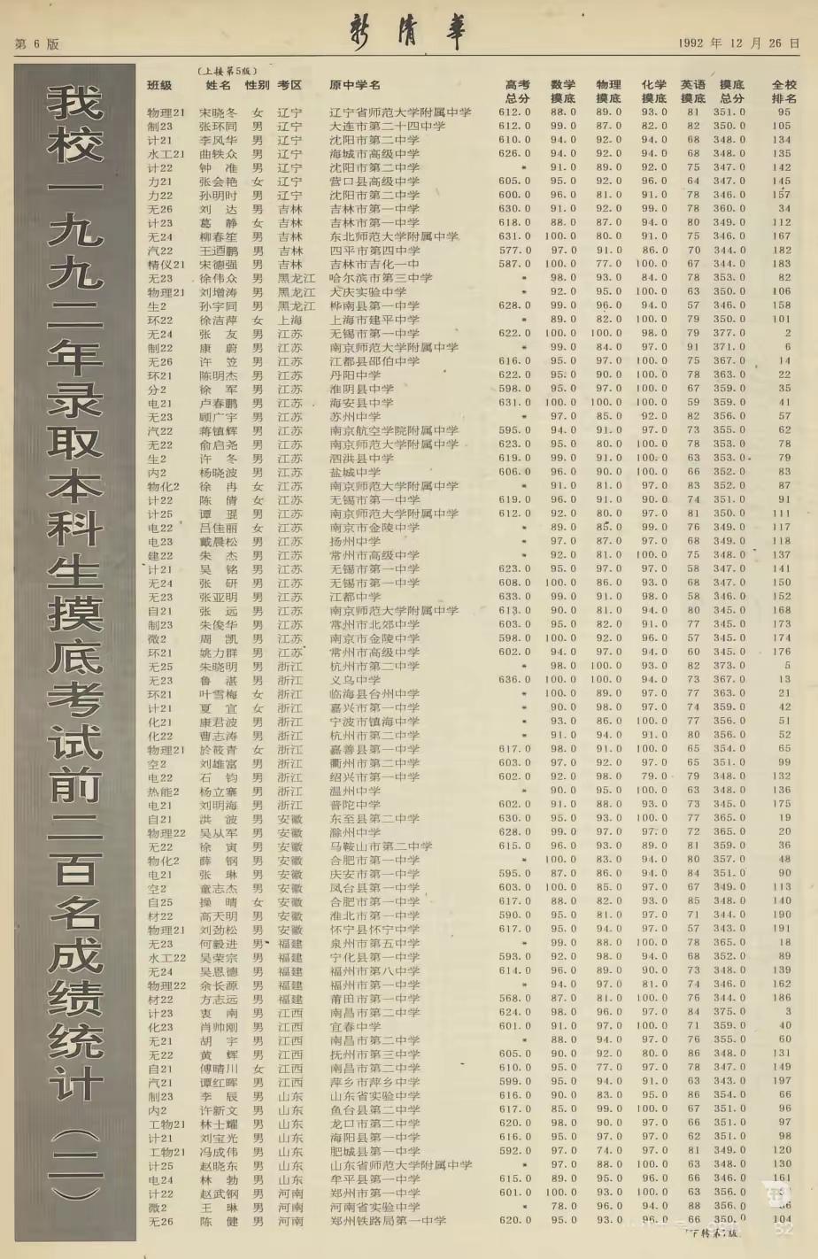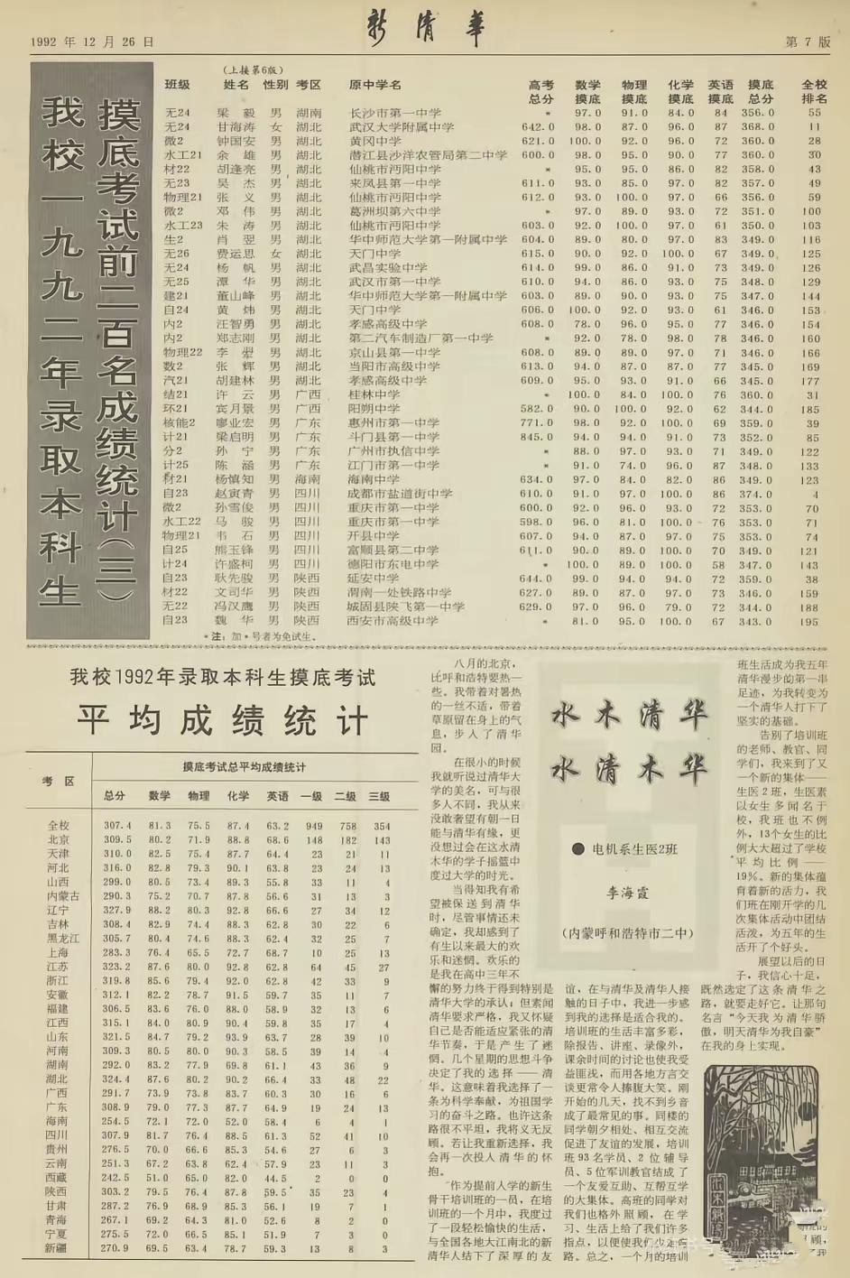 湖北就是厉害,北京也不差。根据清华大学1992年本科新生到校后的摸底考试成绩,前200名中北京、江苏、湖北考生比较多。前10名中,北京考生有4人之多,并且拿下了第一、第七、第八和第九名;前20名中,北京考生也有6人之多。30多年前,北京考生也很能打。 如果按新生入校后摸底考试总分均分成绩表,前10名的省市除了内蒙古之外,其他省市与现在差别不是很大: 根据清华公布的新闻稿,所有省市(含“全校平均”)按总分平均分从高到低进行排名: 排名 考区 总分 1 内蒙古 327.9 2 湖北 324.4 3 上海 323.2 4 山东 321.5 5 江苏 319.8 6 天津 316.0 7 江西 315.1 8 浙江 312.1 9 北京 310.0 10 全校平均 309.5 总分位于全校平均分以后的有哪些省份呢?一起来看: 11 河南 309.3 12 广东 308.9 13 辽宁 308.4 14 安徽 306.5 15 吉林 305.7 16 陕西 303.2 17 河北 299.0 18 湖南 292.0 19 广西 291.7 20 甘肃 287.2 21 山西 290.3 22 黑龙江 283.3 23 贵州 276.5 24 宁夏 275.5 25 新疆 270.9 26 青海 267.1 27 海南 254.5 28 云南 251.3 29 西藏 242.5 🏆 头部梯队(总分 > 318) 内蒙古、湖北、上海、山东、江苏稳居第一梯队,总分均在318分以上。其中内蒙古以327.9分拔得头筹,确实令我惊讶,领先不少。湖北以3.5分的差距紧随其后,上海比湖北低1.2分排名第三。 📉 尾部梯队(总分 < 280) 西藏、云南、海南、青海、新疆等西部省份排名靠后,总分普遍在240-270分区间。西藏总分最低,为242.5分,与第一名内蒙古相差约85分。同为西部地区,差距咋那么大? 💡 数据看点 * 英语是分水岭:排名靠前的省份(如北京、上海、湖北)英语平均分普遍在65分以上,上海北京等地则高于68分,而排名靠后的省份(如西藏、青海)英语平均分多在50分以下,拉大了总分差距。30多年过去了,直到现在北京上海等地的英语仍然领先全国。 理科优势明显:各省份的数学、物理、化学成绩普遍较高且差距不大,说明当时理科基础较为扎实。 92年的下一年1993年的数据可以看这里:
