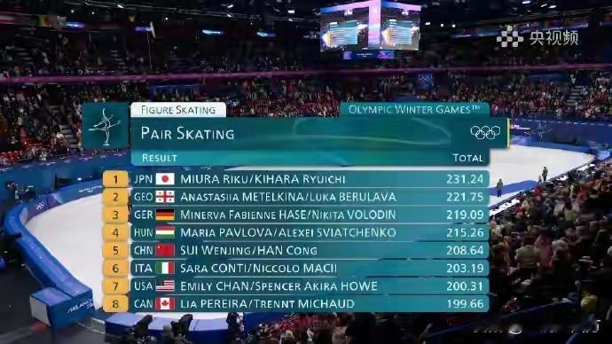 在刚刚结束的米兰冬奥会花样滑冰双人滑比赛中,卫冕冠军隋文静/韩聪最终获得第五名,这已经是中国代表团在北京冬奥会夺金的第五个项目卫冕失败了!因伤病告别赛场又重新复出的隋文静/韩聪,在短节目排名第六晋级到自由滑,在自由滑比赛,两人和着《只此青绿》的音乐顺利完成了动作,可惜难度有限,得到135.98分,加上短节目的72.66分,总得分208.64分,刷新了赛季最佳成绩,最终排名第五。日本组合三浦璃来/木原龙一以总分231.24分夺得金牌,这个成绩刷新了自由滑的世界纪录,这已经是日本在本届冬奥会拿到的第四金,前三金都来雪上技巧类项目。格鲁吉亚梅特尔金娜/贝鲁拉瓦和德国组合哈泽/沃洛丁分获银牌和铜牌。