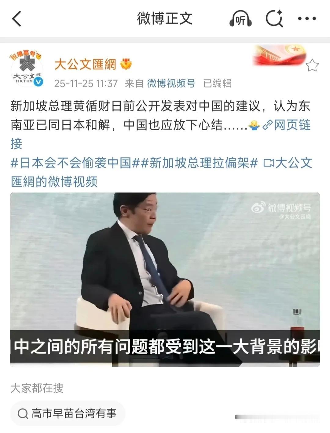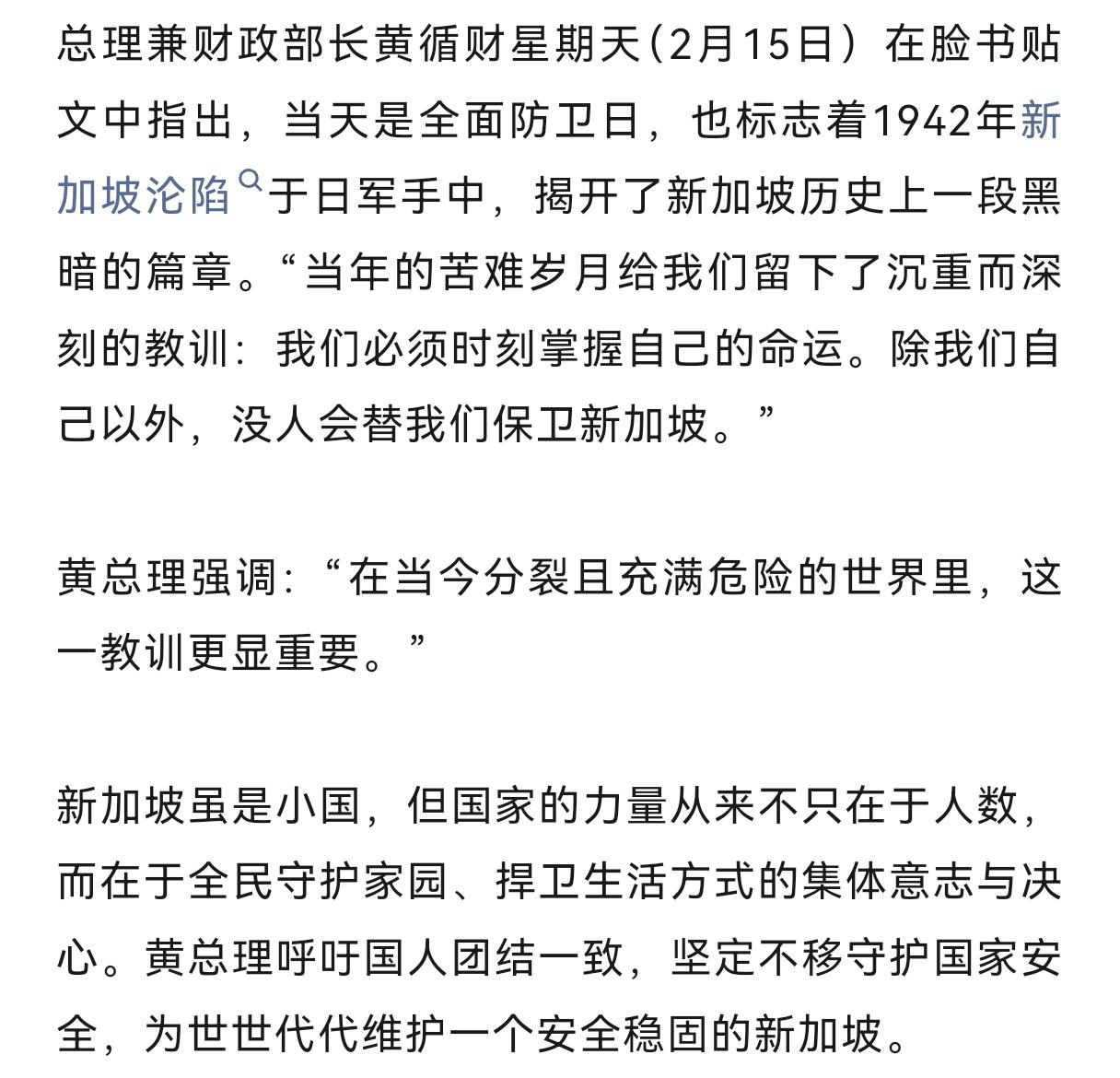 去年11月,新加坡总理黄循财在彭博新经济论坛称东南亚已与日本和解,呼吁中国放下历史包袱,还称日本是东南亚最受信赖大国,支持其在区域安全中发挥更大作用,此番言论被认为是为日本站队。 不到四个月,2026年2月15日新加坡全面防卫日,黄循财发文纪念日军攻陷新加坡的黑暗历史,强调要铭记苦难、掌握自身命运,与此前论调形成鲜明反差。 1942年新加坡遭日军占领,经历三年零八个月黑暗统治,发生大屠杀与细菌战罪行,这是新加坡深刻的民族创伤。新加坡态度转变源于多重因素:日本修宪扩军、插手台湾问题、在东南亚加强军事存在,触动了东南亚国家的敏感神经;黄循财此前言论引发新加坡国内强烈批评,反对党与民众指责其忘却历史;东南亚多国也并未真正与日本在历史问题上和解,对日本保持警惕。 中方则以事实理性回应,揭露日军侵略罪行。新加坡对日本态度的骤变,折射出小国在大国博弈中的战略摇摆与安全焦虑,也反映出东南亚面对日本历史问题与军事动向的复杂态度。