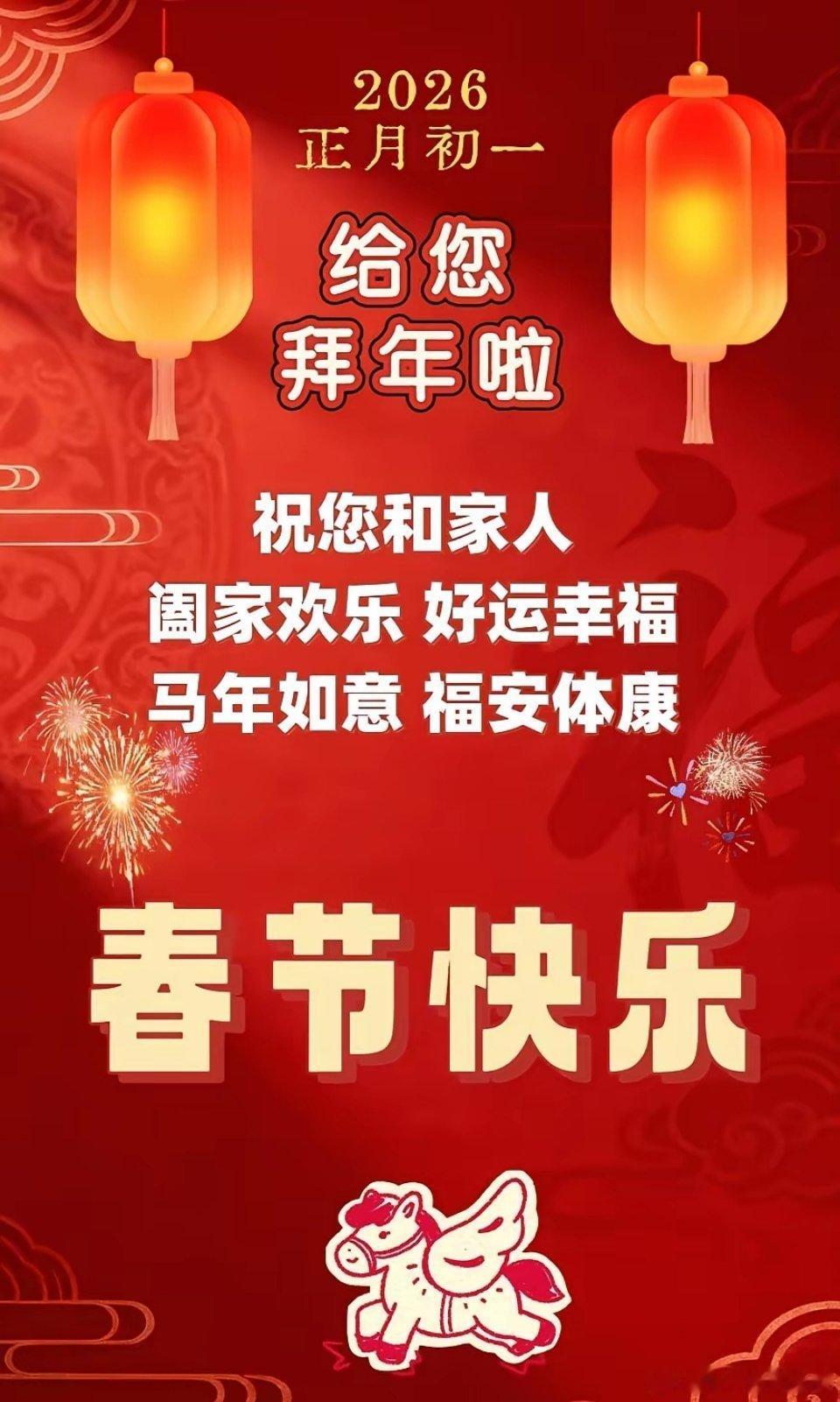 🏮晨安!大年初一,马年大吉🧨💞金鸡报晓,瑞气盈门,2026丙午马年的第一份祝福准时送达。褪去旧岁的尘埃,换上新年的盛装,让我们昂首迎接满堂的好运。🐎愿金马踏春,为你驮来四季的安康,八方的财气。愿你前程似锦,策马扬鞭自奋蹄;愿你阖家团圆,烟火人间共欢喜。🌈新岁新气象,祝你开门红,事事通,福运长绵,早安吉祥!天南地北大拜年马年新年寄语