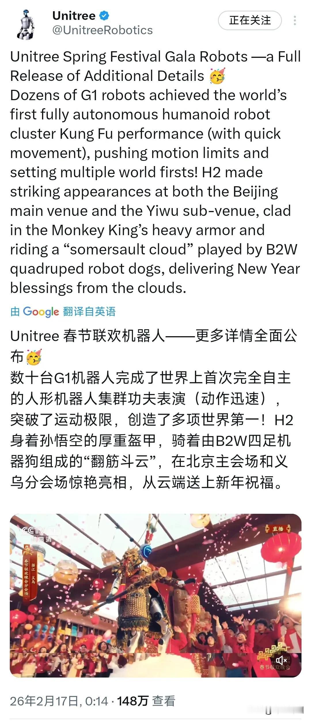 unitree宇树科技今天(2月17日)在社交媒体X上发文写道:“Unitree春节联欢机器人更多详情全面公布:数十台G1机器人完成了世界上首次完全自主的人形机器人集群功夫表演(动作迅速),突破了运动极限,创造了多项世界第一!H2身着孙悟空的厚重盔甲,骑着由B2W四足机器狗组成的‘翻筋斗云’,在北京主会场和义乌分会场惊艳亮相,从云端送上新年祝福。” 评几句: 马年春节,国产机器人带来的表演直接火出圈。宇树科技数十台G1人形机器人同台亮相,完成自主协同的功夫展示,动作利落、配合默契,让不少人大开眼界。 更有创意的是,H2机器人化身齐天大圣,身披战甲,脚踏由机器狗组成的“翻筋斗云”,在北京与义乌两地同步登场,用科技演绎传统神话,给大家送上别样的新春祝福。 从单台机器人表演,到多机协同完成复杂动作,不难看出,国产人形机器人在运动控制、集群调度等方面,正迎来实实在在的进步。曾经只存在于科幻作品中的场景,如今真实呈现在我们眼前。 科技赋能传统文化,既有新意又有底气。这不仅是一场精彩的视觉盛宴,更展现出中国智能制造的快速发展。这样的硬核创新,既接地气又长志气,值得我们点赞!