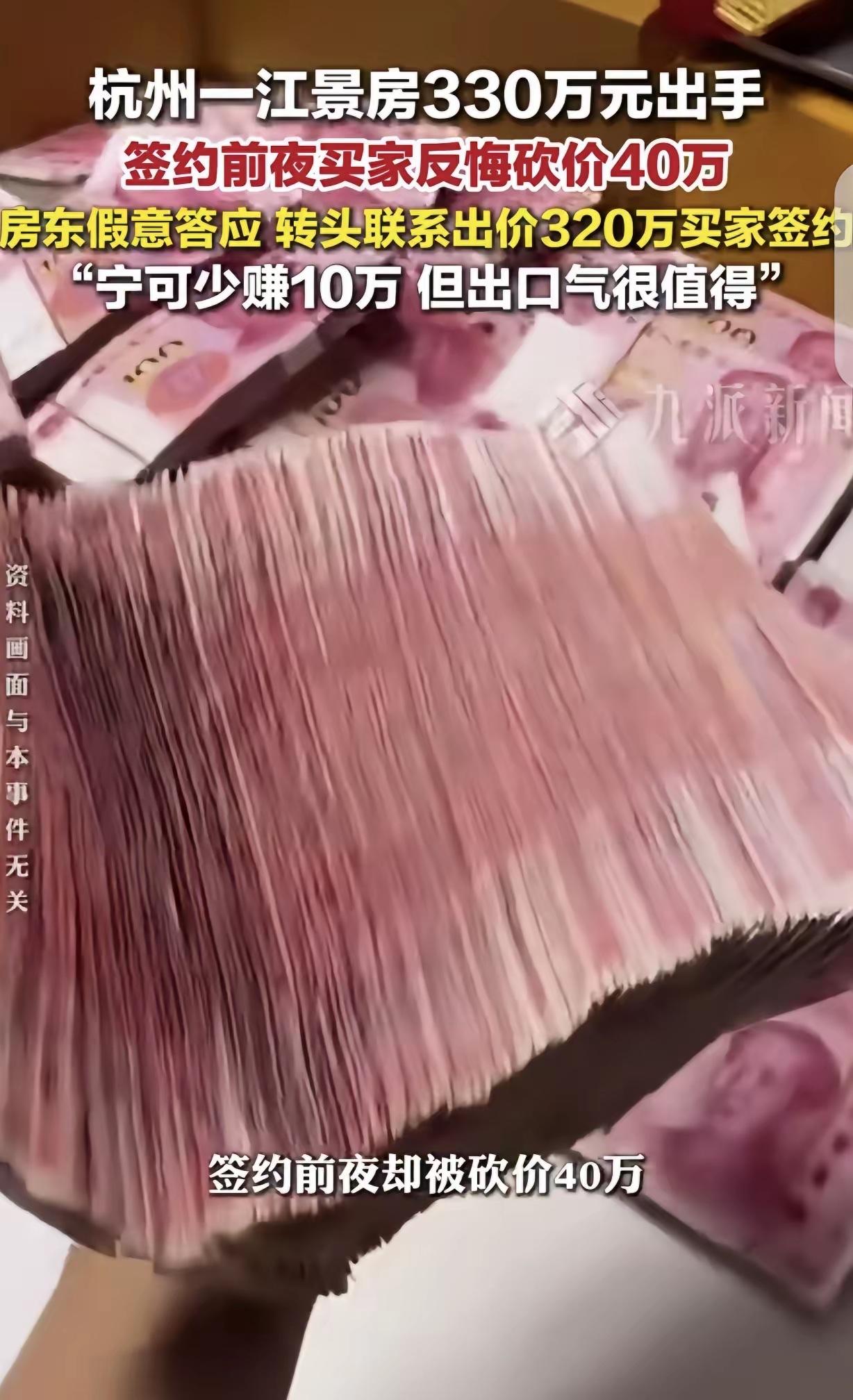 浙江杭州,一男子160平的江景房330万卖了,不料,签合同前一晚,买家突然变卦,非让他便宜40万,房东一看这买家太不讲究了,他假装答应,转头就联系了出价320万的买家,把2个买家都叫了过来,变卦买家傻眼了,同意出330万,可男子却说:就不卖给你,我宁可少卖10万,但这口气必须得出。 杭州钱江沿岸的江景房本就是二手房市场的热门选择,160平的户型开出330万的价格,男子提前找专业机构做过市值评估,既没有漫天要价,也没有刻意压低,是双方多次沟通后敲定的合理成交价。这套房子是他扎根杭州十几年,靠辛苦打拼攒下的资产,从选房到装修都倾注了不少心血,卖房只是为了给家人置换更合适的居所,全程都抱着坦诚交易的心思。 他和这位买家前前后后对接了十几天,房屋产权、交付细节、过户流程全都交代得一清二楚,买家当场敲定价格,明确约定次日签订正式合同。就是这样板上钉钉的事,买家却在签约前夜突然反悔,张口就要砍掉40万房款,这种临时坐地压价的行为,完全抛开了此前的所有约定。 杭州本地的二手房交易圈子里,向来把契约精神放在首位,即便未签书面合同,口头达成的定价共识也是双方的承诺,买家故意趁签约前发难,本质就是不讲商业规矩的投机行为。男子没有当场爆发争执,而是假意顺从对方的无理要求,转头就联系上了此前出价320万的备选买家。 这位备选买家全程沟通都十分诚恳,没有任何刁难试探,只是报价略低10万。男子直接将两位买家约到中介门店当面沟通,临时变卦的买家这才慌了手脚,立刻改口愿意按原价330万成交,以为只要补回差价就能顺利拿下房源。 男子的拒绝没有丝毫犹豫,他心里清楚少卖10万是实打实的经济损失,却更明白面对失信行为绝不能妥协。他卖房从不是急于变现,自然不会为了利益迁就毫无诚信的合作者,这10万差价,换的是对底线的坚守,也是对恶意搅乱交易行为的回击。 如今二手房交易市场里,总有不少买家抱着侥幸心理,抓住卖家怕麻烦的心态临时压价,把前期约定当成一纸空谈,却忘了房产交易动辄百万,诚信才是合作的基础。杭州作为长三角核心城市,房产交易的规范秩序,靠的就是每一位交易者的守信坚守。 男子的做法从不是意气用事,而是戳破了部分人得寸进尺的小心思,没有诚信做底色,再丰厚的报价也换不来长久的合作。宁可让利十万,也不迁就失信之人,这份底气,才是普通人面对不公时最该守住的原则。 各位读者你们怎么看?欢迎在评论区讨论。
