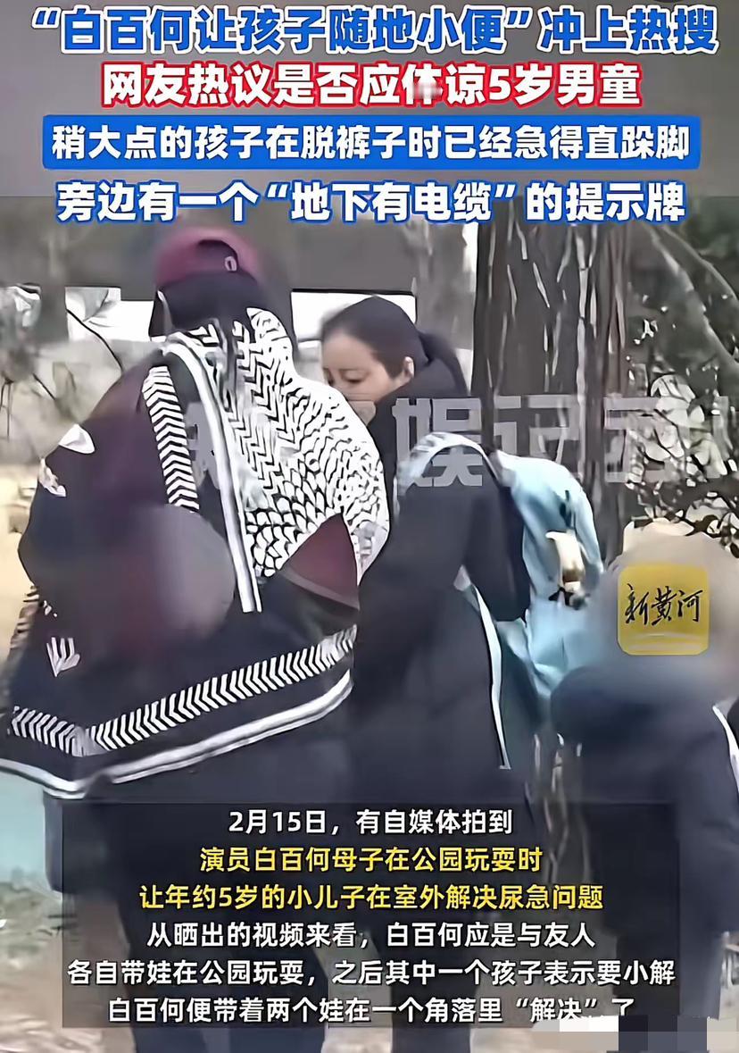 “没必要上纲下线吧?”北京,知名女演员带着两个孩子去公园玩耍,期间,两个孩子玩上头了,一泼尿憋着,导致尿急了。其中一个孩子瘪得直跺脚,女演员见状,赶紧让孩子就地解决!没想到,这段视频被有心之人发布到了网上。网友开始吐槽:太没素质了! 2月15日,娱乐圈又一件小事冲上了热搜榜首,演员白百何,被拍到带着孩子在公园角落里随地小便。 这件事一曝光,立刻在网上炸开了锅 41岁的白百何早已把生活重心放在家庭,大儿子已成年,小儿子刚满5岁,正是玩起来忘乎所以、生理需求不受控的年纪。视频里孩子憋到跺脚的模样,是低龄孩童最真实的本能反应,没有半分刻意表演的成分。她选的是公园地下电缆标识旁的隐蔽角落,并非开阔草坪或人行主路,全程还下意识用身体护住孩子,不想让娃的隐私被镜头捕捉,这份谨慎,和她多年不晒娃、不炒亲子人设的低调育儿态度完全契合。 没亲历过带低龄娃出门的人,总盯着“随地”二字扣上没素质的帽子,认定公众人物就该时刻完美,一言一行都要严守文明标尺。真正当过父母的网友却一眼读懂这份无奈,四五岁孩子的膀胱控制能力本就有限,玩到尽兴时根本顾不上提前找厕所,等喊出要如厕的瞬间,多挪一步都可能憋不住,这不是公德缺失,是孩童生理发育的客观规律。 普通家长在公园、小区遇到同款窘境,多半也是找隐蔽处快速处理,很少有人会揪着不放,怎么换到白百何身上,就成了全民批判的失德行为?公众人物的身份确实要求她更注重言行边界,但这份要求不该变成不近人情的苛刻,更不该被恶意偷拍、掐头去尾放大成舆论狂欢。 视频拍摄者刻意捕捉儿童隐私画面,再剪辑发布引流,这种侵犯未成年人权益的行为,远比情急之下的应急如厕更该被谴责。我们可以倡导家长常备便携尿袋、提前规划如厕路线,也可以呼吁公共场所增设儿童友好厕位,却不该对一次生活里的小意外上纲上线,用冰冷的规则抹杀为人父母的本能与人间体谅。 白百何这些年淡出流量荧幕,素颜陪娃逛公园、露营抓蝌蚪,过着最朴素的妈妈生活,没有明星架子,只有陪伴孩子的踏实。生活本就藏着无数细碎的狼狈,明星也是普通人,妈妈也是普通人,别让网络的放大镜,磨掉了最基本的人情温度。 各位读者你们怎么看?欢迎在评论区讨论。