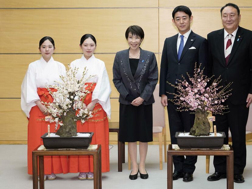 日本福冈县太宰府天满宫“梅之使节”一行,专程向首相高市早苗赠送梅花盆栽。从现场可以看到,高市早苗身着黑裙套装,居中而立,毫不谦虚地接受这份承载风雅与地方心意的赠礼。值得一提的是,太宰府天满宫为日本“学问之神”菅原道真总本宫,素以飞梅传说与梅文化闻名,“梅之使节”赠梅是延续多年的传统仪典,但这次赠送高市确实有点送错人,要知道,梅花寄寓坚韧、清雅与吉祥,高市不值当!