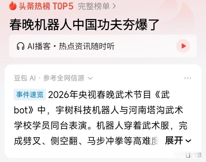 春晚机器人中国功夫了得,宇树机器人和和河南塔沟武术学校同台表演,他们的表演可以说是让人赏心悦目,功夫了得。中国机器人也太厉害了,希望中国机器人越来越厉害。 不知道你们发现没有,机器人还拿剑表演,说实话拿剑的时候,有点担心万一不配合那怎么了得,还好顺利完成。 你们怎么看机器人的表演呢?
