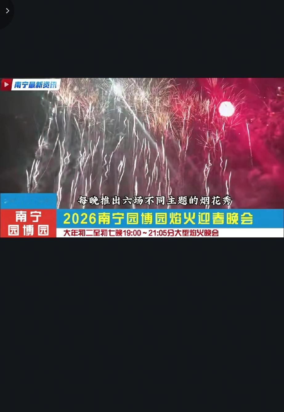 2026年南宁园博园焰火迎春晚会,于大年初二至初六在南宁园博园举办,是南宁市重磅打造的新春主题烟花秀。活动持续五天,每晚推出六场不同主题的烟花秀,每场有一万一千发烟花直冲天际,晚会总时长125分钟,将为观众带来震撼的视觉盛宴。(来源于@Julie朋友圈)