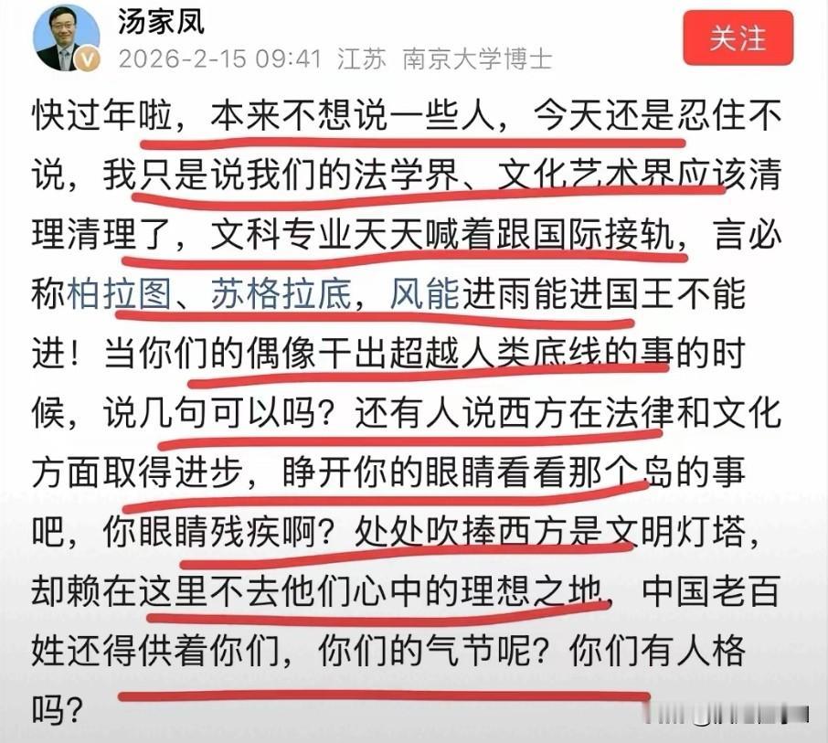 汤家凤春节炮轰公知引爆舆论 汤家凤春节公开炮轰部分公知。 南京大学汤家凤春节期间整挺狠,直指法学界、文艺界部分群体,明确提出清理门户,留存这类人只会成为社会祸害。 他点出这类人长期崇洋媚外,立场像深扎土里的树根,根本无法撼动,始终将西方观点奉为圭臬,刻意无视西方社会的真实乱象。 相关言论发布后,网友留言没惯着,直言这类人连耻辱柱都不配触碰,评价扎心又直白。 话题快速冲上社交平台热榜,全网讨论量持续走高,民间观点普遍支持汤家凤的表态。 此次发声没含糊,是对部分群体双标言行的长期不满集中释放,这类人长期美化西方乱象,持续扭曲公众认知。 事件暂未出现官方回应,舆论场仍在持续发酵,涉事群体未作出公开回应,相关话题讨论度保持高位。 各类观点持续碰撞,事件后续走向暂未明朗。 你怎么看?评论区聊聊。