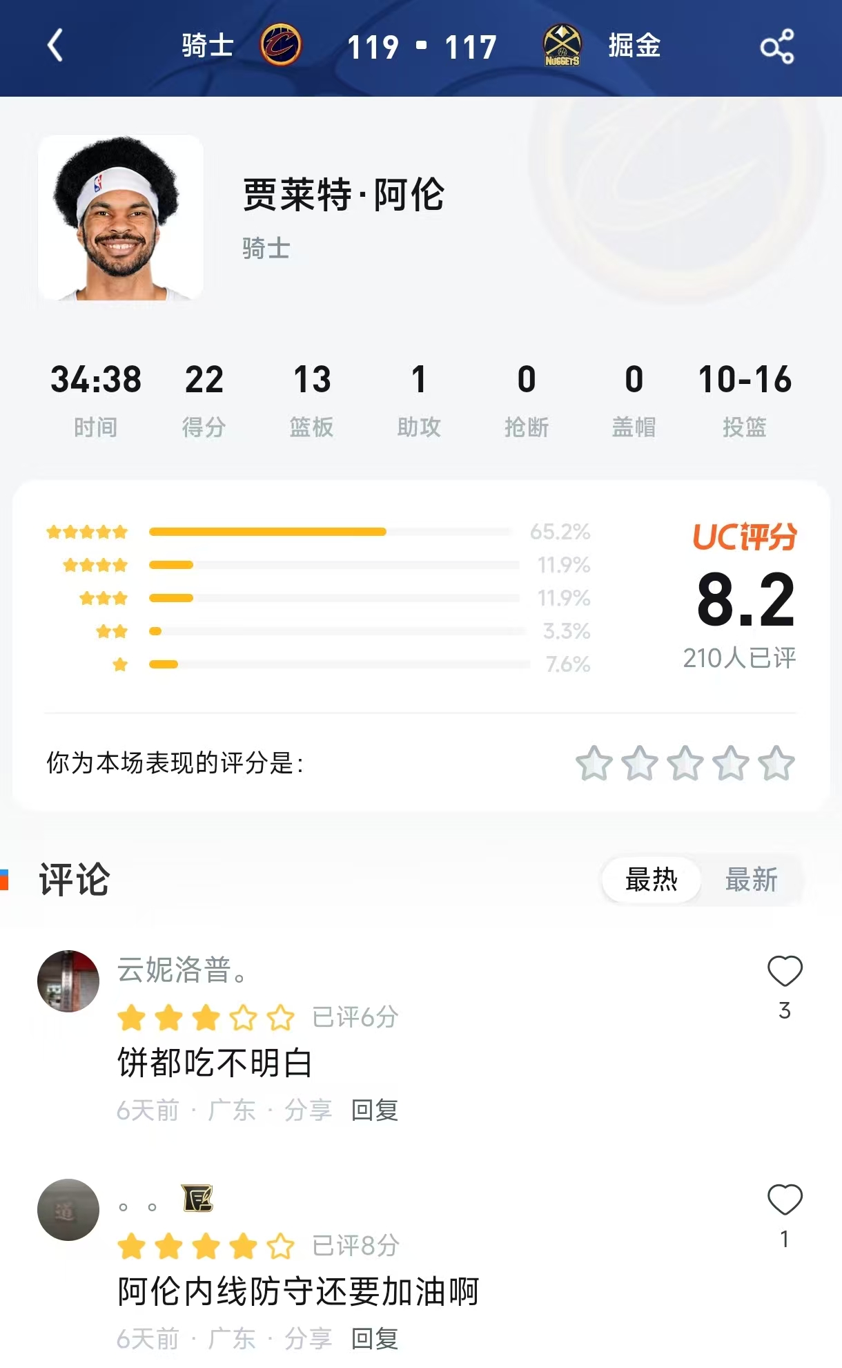 在这场被誉为“东部新贵”与“西部冠军”的顶尖对话中,聚光灯自然对准了轰下32分10助的米切尔,以及关键时刻命中扳平三分、全场砍下22分10板7帽的哈登 。但在星光熠熠的背后,骑士队的“双塔”之一——贾莱特·阿伦,用一张看似平平无奇的成绩单,却在赛后UC的评分区里引发了激烈的口水战。
