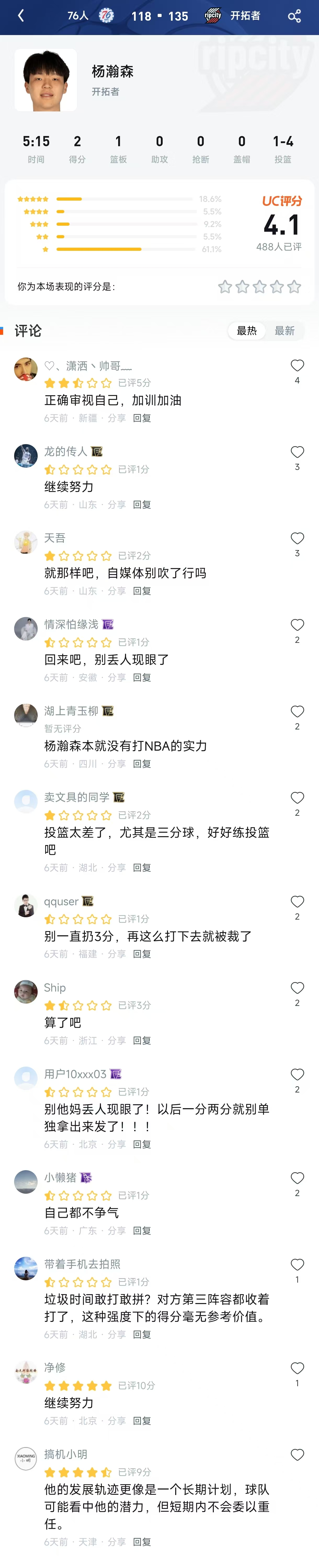 看着这醒目的 61.1%的一星率,以及评论区里清一色的“丢人”、“回来吧”、“别吹了”,恍惚间让人以为开拓者惨败了30分,或者杨瀚森在场时挖了多大的坑。