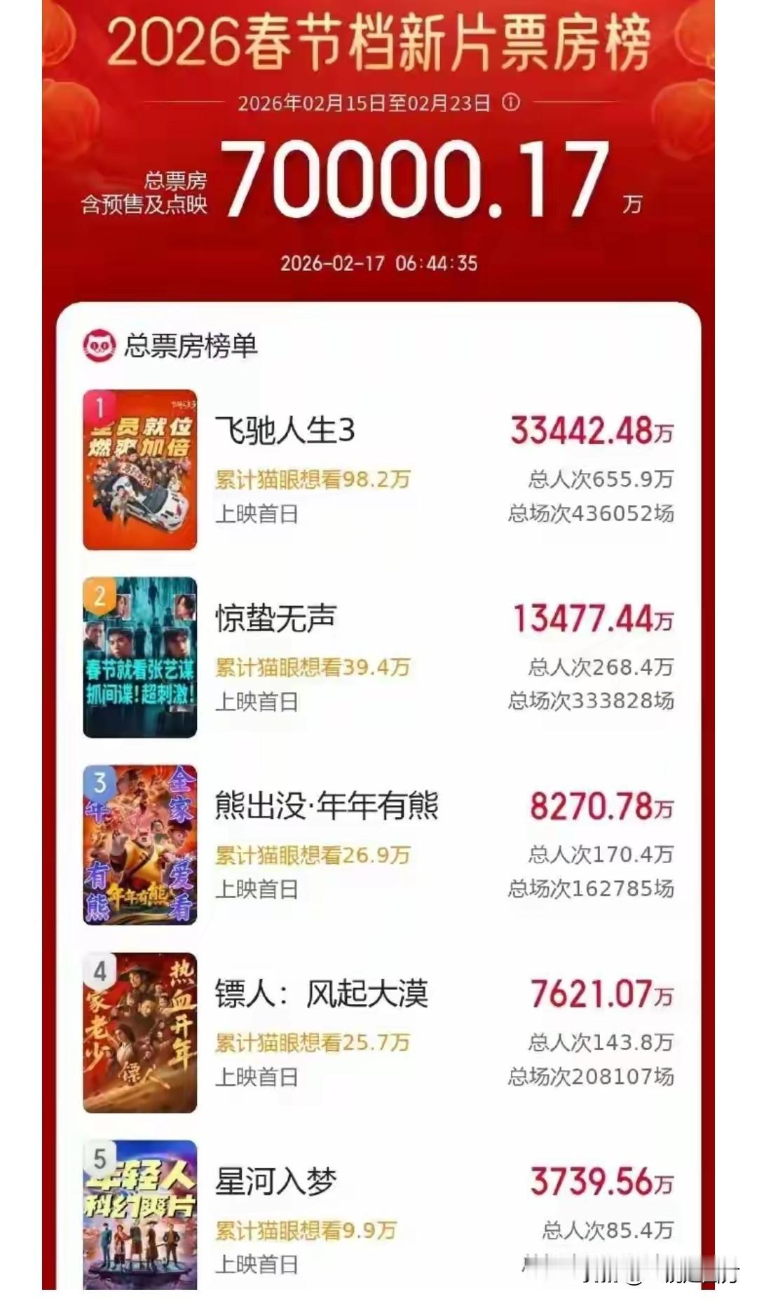 春节档电影终于与大家见面,票房表现各有千秋,在排片相近的情况下,《飞驰人生3》票房领先优势明显,看来沈腾还是很有号召力的,而《惊蛰无声》低了不少,被认为会成为春节档“三驾马车”的《镖人:风起大漠》虽然排片率位居第三,但票房表现一般。