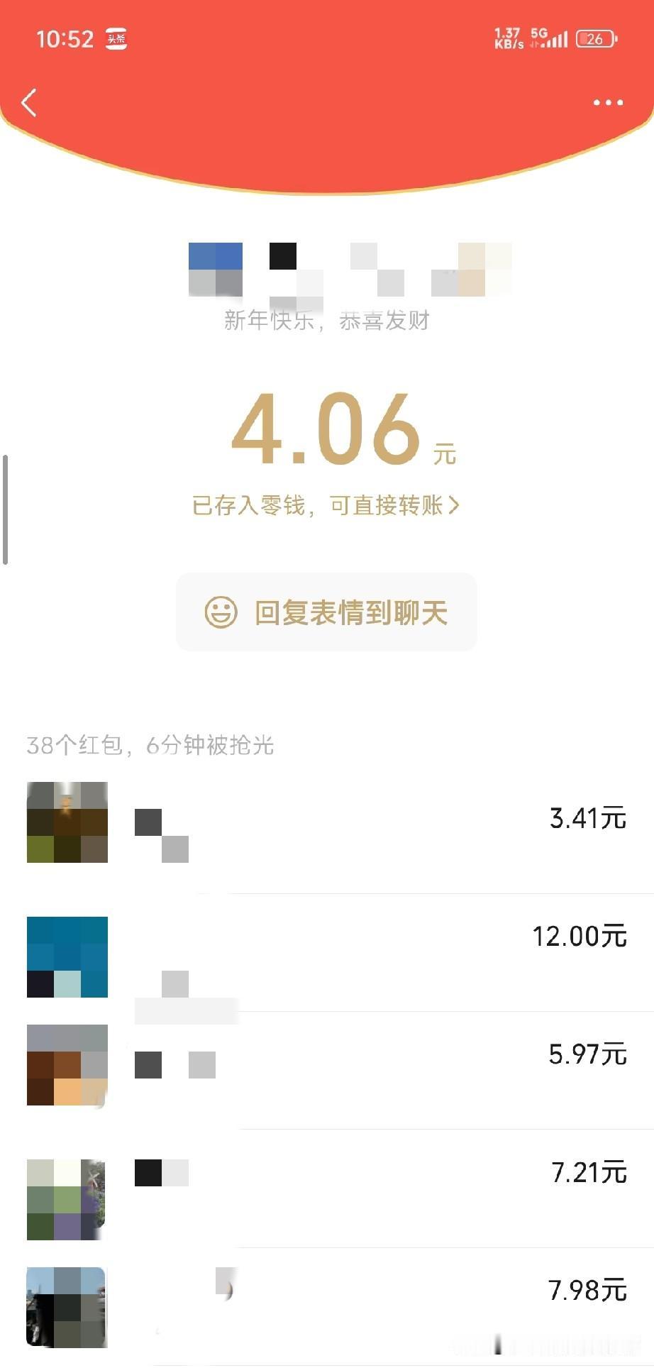 等了一晚上,老板终于发红包了 点开后我沉默了… 熬到快零点,群里终于弹出老板的红包提醒,我手都抖了,结果点开一看:4.06元。 再往下翻,群里的手气王直接12.09元,还有人12元,我这4块多,连个零头都算不上。38个红包,6分钟被抢光,我盯着屏幕半天没缓过来。 说不难受是假的。辛辛苦苦干了一年,就盼着过年这点彩头,结果就这点钱,连买杯奶茶都不够。不是我贪心,就是觉得心里堵得慌——这红包,更像个打发人的“安慰奖”。 同事们在群里刷着“谢谢老板”,我却连复制粘贴的力气都没有。你们过年收的红包,有比我还离谱的吗?