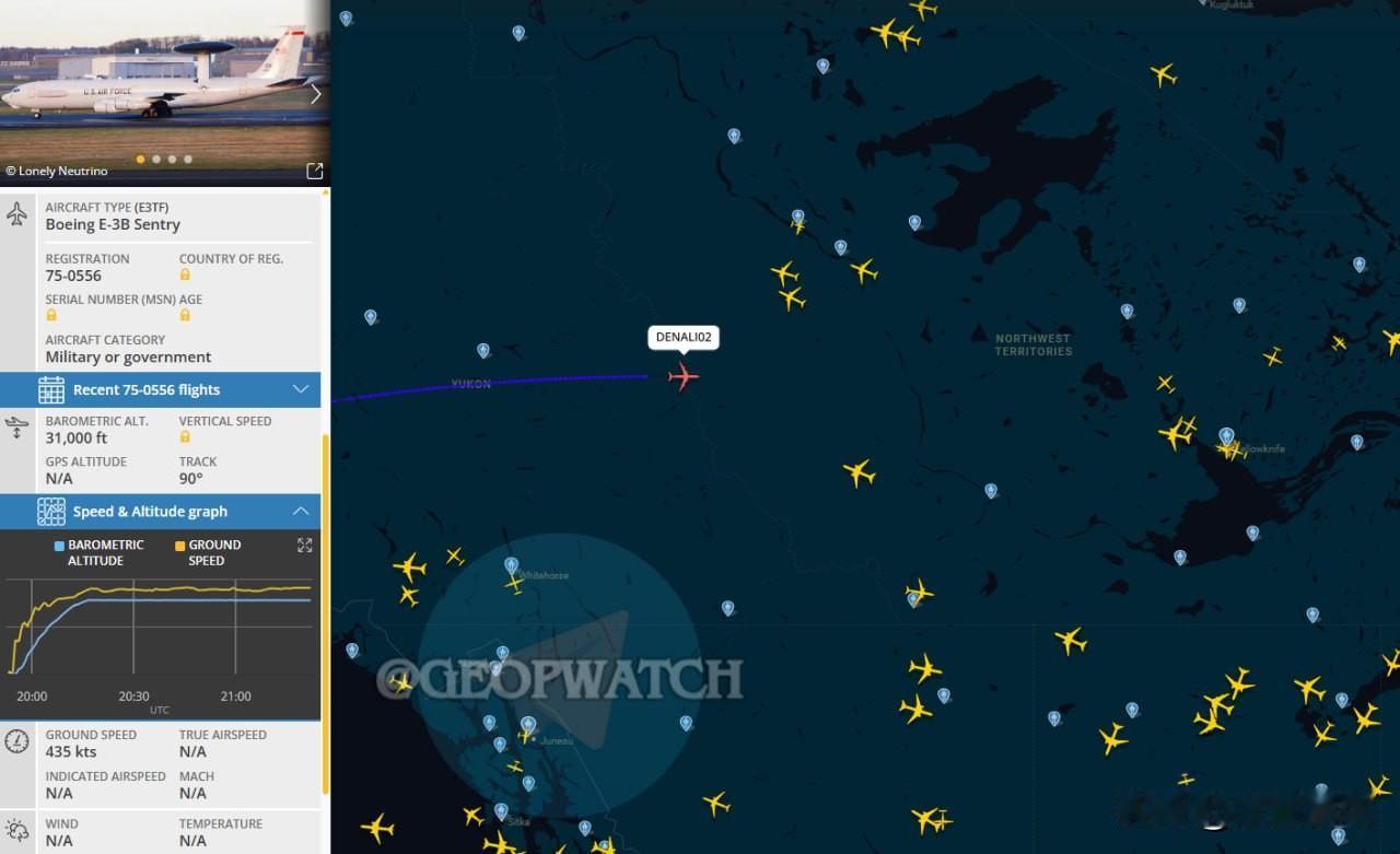 2架美国空军E-3B/C预警机,已从美国阿拉斯加的艾尔森空军基地起飞,飞往英国皇家空军米尔登霍尔空军基地,目的地很可能是中央司令部。 来源:Geopolitics Watch
