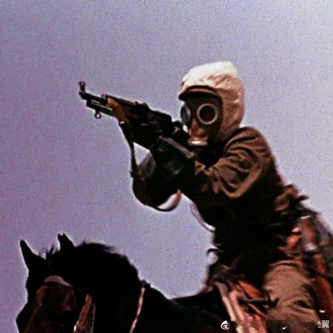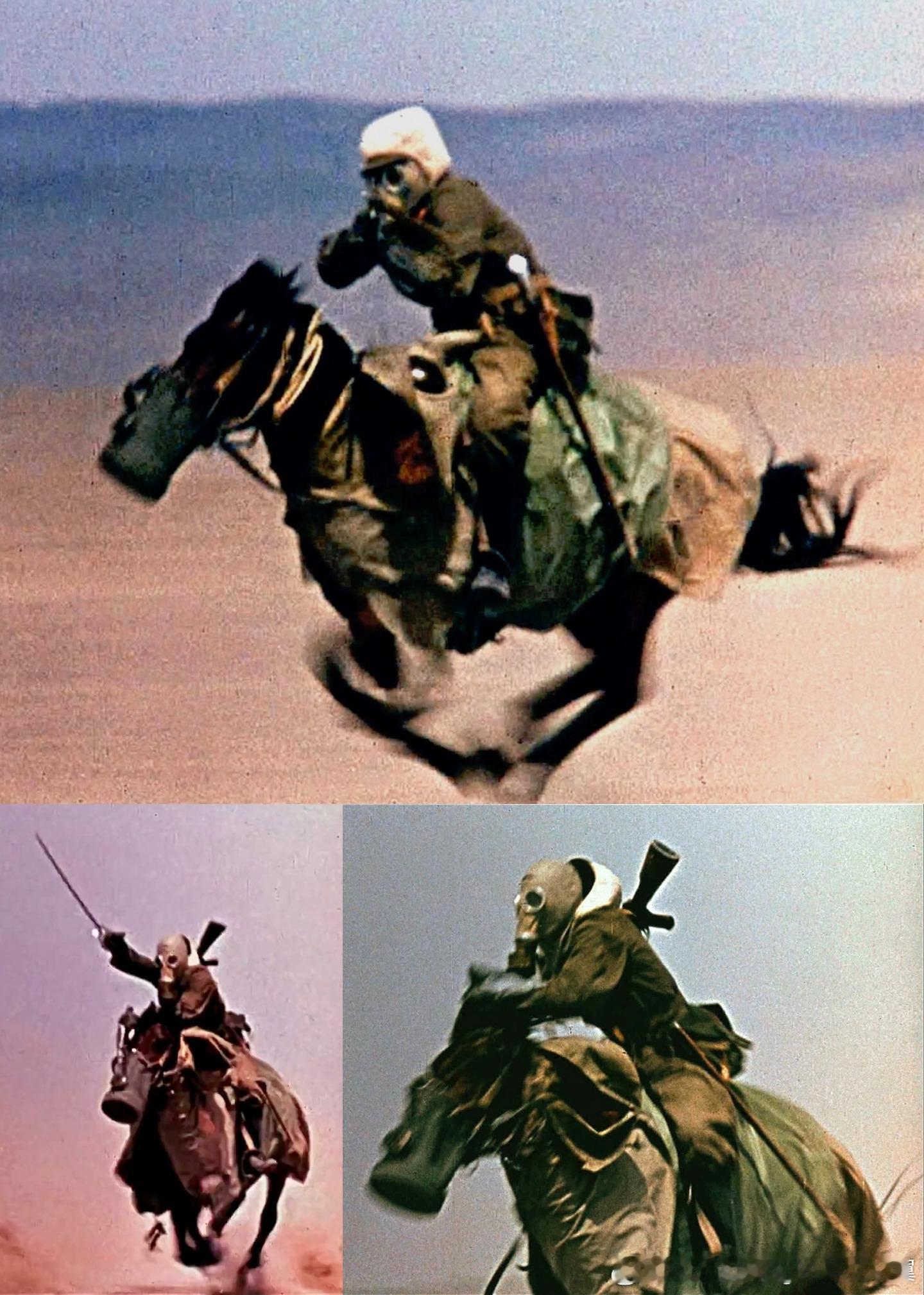 画面中,骑兵战士身着厚重的全身防化服并佩戴防毒面具。值得注意的是,战马也配备了专门的防护头罩,以遮蔽口鼻,防止吸入放射性尘埃。