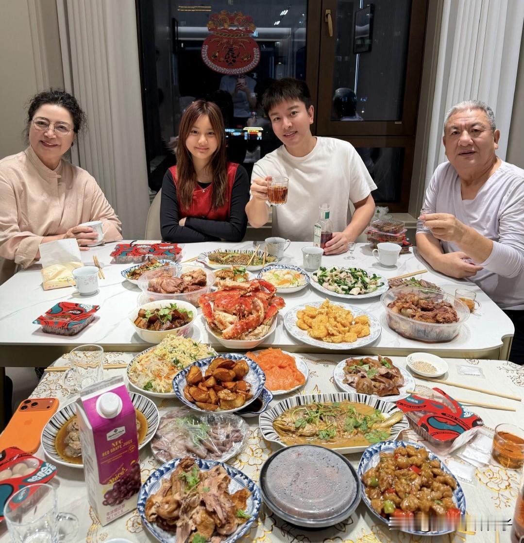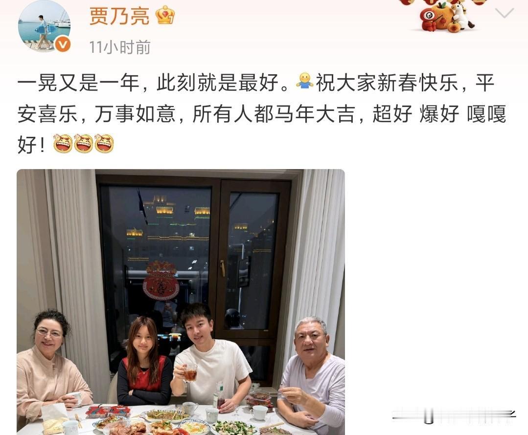 大年三十,甜馨陪爸爸贾乃亮吃年夜饭! 2月17日,贾乃亮凌晨还没有入睡,在社交平台发文,字里行间,难掩内心的喜悦,并晒出一张与家人的合照,竟然看到甜馨的身影。 一看照片,太理解贾乃亮的心情了,难怪笑的合不拢嘴,过年就是要家人团聚,其乐融融。 如果没猜错,两位老人,应该是贾乃亮的父母吧,看起来状态特别好。 甜馨坐在爸爸身旁,肉眼可见的开心,打扮的好喜庆,父女同框画面好温馨。 该说不说,必须夸赞一下李小璐,真是个体面人,大过年,让甜馨陪伴父亲,爷爷奶奶也能见到孙女,做法非常得体。 另外,贾乃亮也准备了一大桌子年夜饭,真的好丰富,拔丝地瓜,炖鱼,凉菜,溜肉段,海鲜,排骨,红焖肉……,很多都是东北特色,看着好有食欲。 注意到一个细节,本以为一家人会围着大圆桌就餐,结果竟然用两个小桌子拼凑在一起,太接地气了。 正如贾乃亮所说,一晃又是一年,此刻就是最好。 确实,父母身体健康,女儿在身旁陪伴,这就是最大的幸福,估计连年夜饭都吃的格外香。