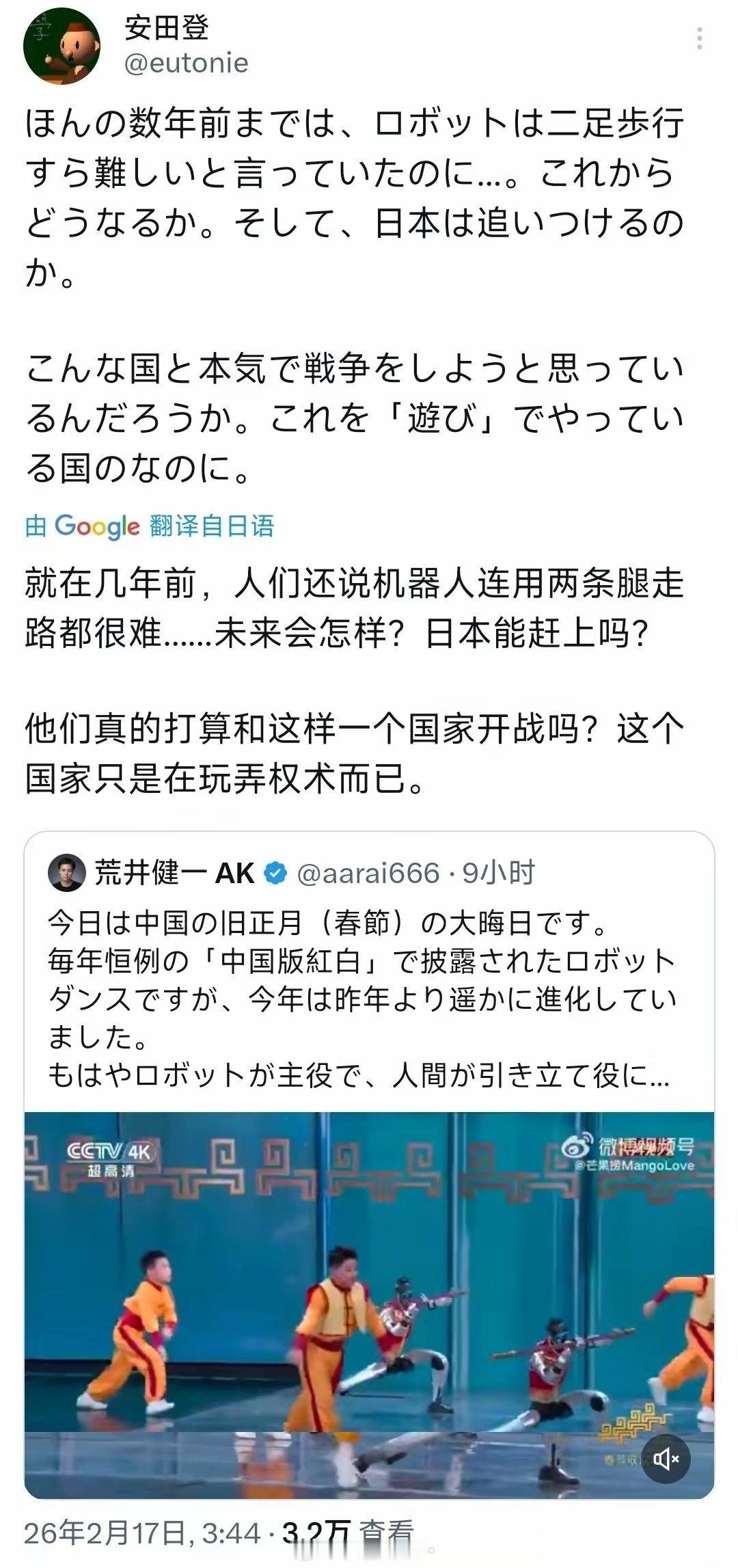 看了春晚机器人表演的片段后,推特上出现了许多日本人的反思。顺手截了几个供参考。