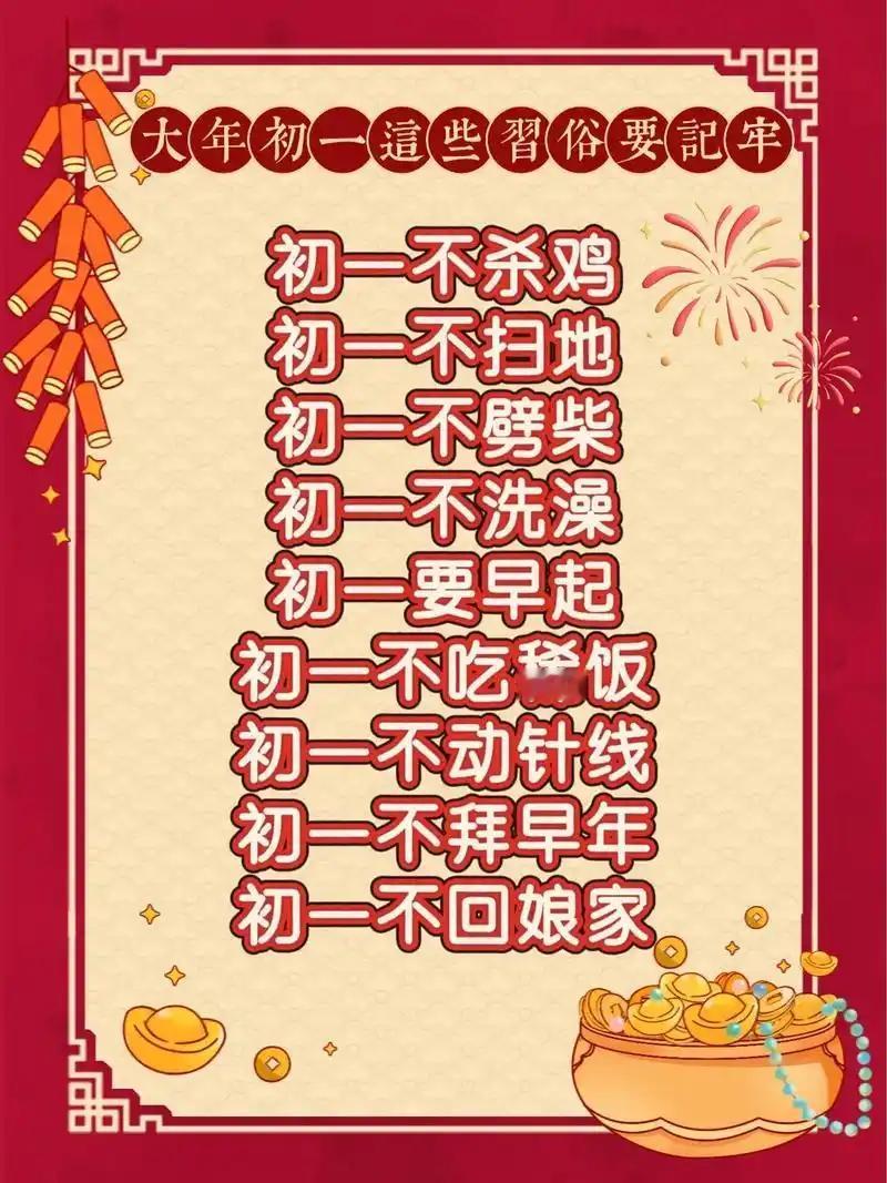今天是马年大年初一,你知道有哪些传统习俗需要遵守吗?不借、不拜、不穿旧衣……这些老规矩真的有效吗? 今天是2026年的大年初一,马年的第一天。许多家庭遵循着传统的习俗,以求新的一年吉祥如意。根据老一辈的说法,大年初一这天不借钱给他人或向他人借钱,以免带来不吉利。此外,大年初一拜年不宜太晚,最好在早上八九点到十一点之间进行,这样既能尊重主人家的休息时间,又能体现自己的礼貌。最后,不穿破旧衣服也是马年的重要传统之一,因为这象征着“辞旧迎新”,意味着甩掉过去一年的晦气,迎接新的好运。这些习俗看似有些迷信,但背后蕴含着人们对新一年的美好祝愿和期望。 初一习俗禁忌