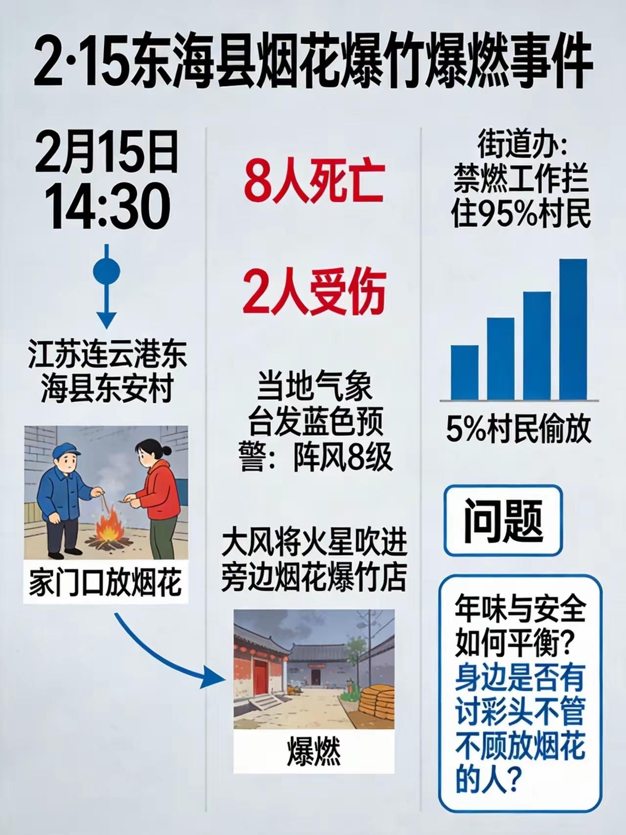 事发连云港,一声鞭炮响,8人地上躺,2人被灼伤 蛇年一个整年中的363天都比较安全,江苏省未发生重大的安全事故,可就在蛇年仅仅剩下两天时间,东海县的一烟花爆竹摊位却爆出了意外的惊天的事故,仅仅在一个小时之内就带走了8名鲜活的生命,另外还有两人轻伤。 事实上,烟花虽美,小心成“炸弹”,而燃放烟花爆竹本身就存在一定安全风险,尤其是在烟花销售点外燃放,那么其危险系数就会大大增加,东海的问题应该是就出在这里了。村民胆子真大,他竟然选择在村口烟花爆竹经营部门前点燃了试放的烟花。 2月15日晚,国家应急管理部紧急召开应急、消防系统调度会,通报江苏连云港东海县烟花零售店发生爆炸的情况,警示各地深刻汲取教训,加强烟花爆竹生产、运输、销售、燃放各环节安全监管和安全宣传,坚决避免类似事件再次发生。 从目前情况看,涉事经营部可能存在选址不合规、安全距离不达标、超量储存等问题。根据《烟花爆竹安全管理条例》,零售点应与学校、医院等敏感场所保持100米以上安全距离,且严禁“下店上宅”“前店后宅”经营模式。若经营部与民房混杂,或储存量超过许可证核定范围,将直接导致事故后果扩大。烟花爆竹在存放、运输、销售甚至燃放过程都存在极高的安全风险。尤其在厂库、经营部等存有大量烟花产品的地方,一旦有明火或火源接触,很可能瞬间引发爆燃。法规上对烟花爆竹的管理已有明确要求,个人燃放也必须严格按照当地安全规定执行,避免在储存区域或高风险地点点燃。 烟花爆竹,当禁则禁,当限则限,当罚则罚,当抓则抓,不要对烟花爆竹违法行为有任何宽容,一宽容就出事。禁限烟花要动真格,要以铁与血的意志推进烟花管控工作,必须上铁腕行动。从法律约束看,开车出交通事故,很容易确定责任主体;而烟花炸伤人,炸毁物品,责任主体难确定。同时,烟花爱好者的道德素质总体低下,出事后不主动承认自己犯下的错误为常态操作。迄今为止,没有一个烟花爱好者是主动承认犯错、积极承担事故责任的。 祸兮福之所倚,福兮祸之所伏。东海烟花惨案,付出沉痛的代价,但也因此给接下来的烟花管控工作带来了极大的推动。恩格斯曾说,一个聪明的民族,从灾难和错误中学到的东西会比平时多得多。希望全国从东海烟花惨案中汲取教训,防微杜渐,防患未然,坚决、彻底、全面地将烟花管控工作进行到底! 小时候,过年逛街,看见卖鞭炮的,为了吸引人,点燃一封鞭炮丢远了炸,飞了一个过来,开始点燃开箱中的一封,然后连锁反应,炸着炸着,堆在一起的几十箱鞭炮尽然一起炸了,还升起来黑色的蘑菇云,幸好卖鞭炮的被拖走了,不然后果严重,从开始到全部炸锅最多就30秒,所以鞭炮炸起来了就赶紧跑,不要想着去灭火,没用。一个5平米的烟花铺,堆满烟花,大概有40kg的火药,相当于14kg的TNT,相当于250枚手榴弹,一起炸的威力,周围有多少人团灭多少,所以看见烟花铺开始炸、失控,不要犹豫,赶紧跑。