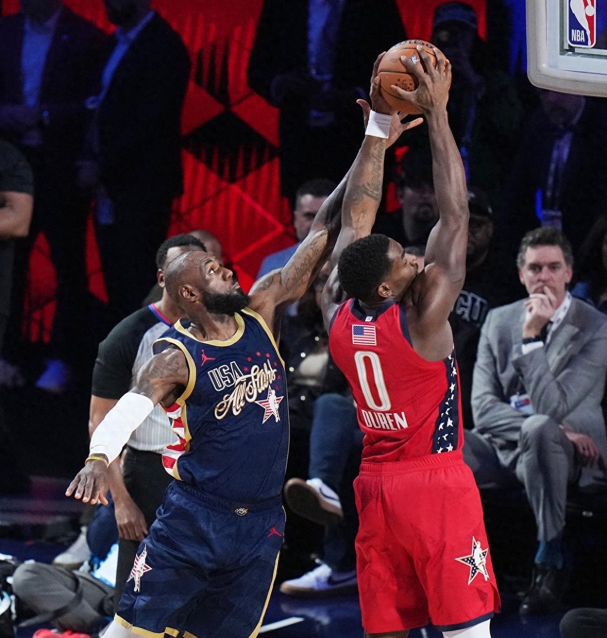 美国条纹队48-45世界队,卡哇伊31+3+2,杜兰特7+1+1 2026年2月16日,NBA全明星循环赛第三场在12分钟单节决胜规则下展开,美国条纹队与世界队正面交锋,比赛强度远超以往表演性质的全明星舞台,胜负悬念被压缩在短短一节时间里。 美国条纹队此役由伦纳德、布伦森、杜兰特、詹姆斯、杰伦-布朗首发出战,世界队则派出文班亚马、贾马尔-穆雷、西亚卡姆、唐斯、阿夫迪亚应战,阵容对位清晰,没有试探。 这场比赛之所以受到关注,并不只是因为两队分组对抗,而是赛制改革带来的直接影响,两战全胜者将锁定决赛资格,每一次进攻都带着淘汰意味。 开局阶段,世界队利用文班亚马与唐斯的内线高度持续冲击,美国条纹队依靠个人单打和外线投射维持节奏,比分始终咬住,没有一方取得明显优势。 詹姆斯在场上更多承担组织职责,三次出手只命中一球,得到2分,却送出全队最高的4次助攻,节奏掌控仍在,只是终结欲望明显下降。 杜兰特全场7投3中,三分4投1中,拿到7分1篮板1助攻,外线手感并不理想,出手选择偏向效率,而不是数量。 布伦森5投3中,三分3投2中,贡献8分1篮板2助攻,成为外线衔接的重要节点。杰伦-布朗3投0中,没有得分,仅有1次抢断和1次助攻,锋线环节一度出现空档。 比分来到最后3.5秒时,双方战成45平,球权交到伦纳德手中。伦纳德此前已经13投11中,三分7投6中,罚球3罚全中,独得31分外加3个篮板2次抢断,效率几乎没有波动。 面对防守,伦纳德完成节奏变化,撤步拉开空间,三分出手命中,美国条纹队48比45领先。世界队最后一次三分出手未能命中,比赛就此定格。 两战全胜的美国条纹队锁定决赛席位,伦纳德成为全场最具决定性的存在。这场比赛真正值得讨论的并不是詹姆斯的2分,而是角色变化。 在高强度单节决胜模式下,体能分配与战术定位被放到台面上,詹姆斯主动后撤到组织位置,减少持球终结,更多为队友创造空间。 伦纳德则承担起得分核心责任,用31分直接左右走势。杜兰特与布朗的输出不足,使比赛一度悬在半空。胜负的分界线其实很简单,关键回合的稳定性。 伦纳德13投11中的命中率提供了绝对保障,美国条纹队在高压节奏下没有出现连续失误。世界队内线优势明显,却未能在最后回合转化为得分。 48比45的比分并不夸张,却真实呈现了竞技强度。全明星赛制的变化,让球星的状态不再被娱乐氛围掩盖。这场比赛之后,核心话语权的讨论不会停止。伦纳德用数据和关键球给出答案。