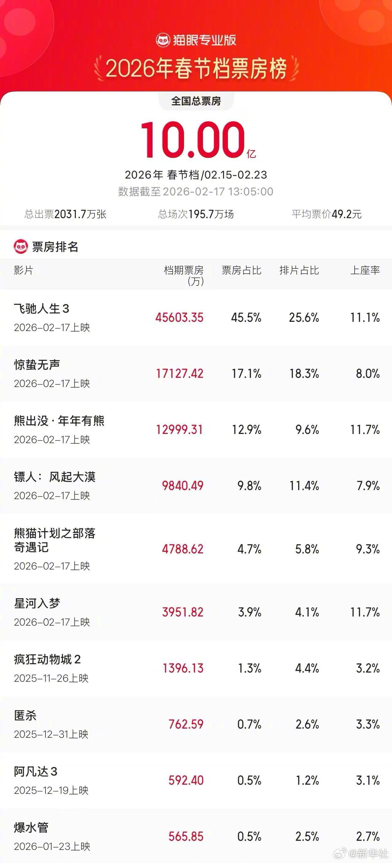 【#2026年春节档票房破10亿#】#票房# 据网络平台数据,2026年春节档档期总票房破10亿,等主演的《飞驰人生3》,等主演的《惊蛰无声》、《熊出没》和 谢霆锋梁家辉 等主演的《镖人:风起大漠》分列2026年春节档票房榜前四。 一起聊聊,#你最期待哪部春节档电影#?(新华社)