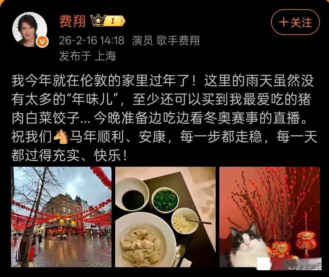 这就是年夜饭。简简单单一盘饺子,陈醋、蒜末、葱花。为什么如此寒酸? 这可是全中国人民都认识的费翔的年夜饭。他是在伦敦过的农历年。虽然身在异国他乡,依然没有忘了习俗——吃饺子,可见炎黄子孙没有忘本。