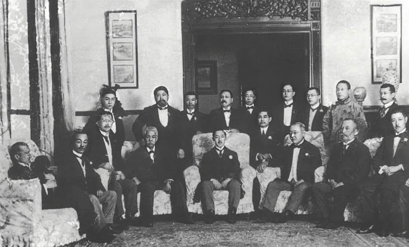 1913年5月7日晚,上海日本驻沪总领事馆(虹口领事馆二楼),孙中山设宴款待日本贵族院议员德川庆久公爵一行上海,主要目的是希望日本不要支持袁世凯。宋教仁遇刺后,孙中山强烈怀疑袁涉案,急于拉拢日本势力“联日制袁”。当时日本在华巨大影响力——政治、军事、经济层面均有干预能力,革命党人不得不借重日本关系应对袁世凯。 一般合影中,前排坐者多为地位尊者,后排站立者为陪同,我们可以看到日本议员多居中或主位,后排站立者,从右至左可见几位关键人物:陈其美 → 黄兴 → 戴季陶。其他人物包括日本领事有吉明、西田畊一等日方人士,以及伍廷芳、王宠惠、陈锦涛、周金箴、王一亭等中方陪同。