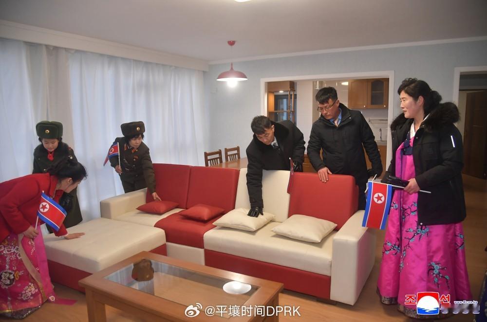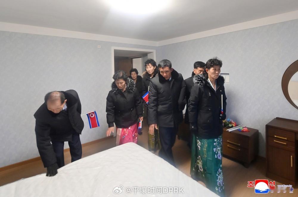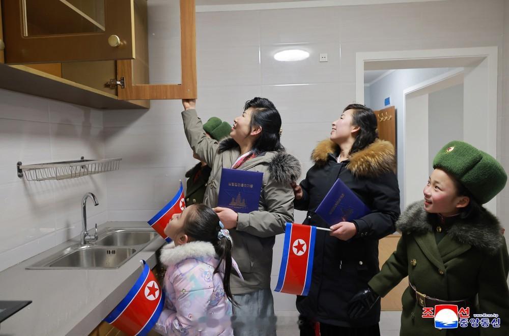 金正恩同志来到鱼泰哲烈士的遗孀金正玉的家庭,一一察看住房和厨房等,以亲生父亲的心情听取他们一家人分得新居的感想。