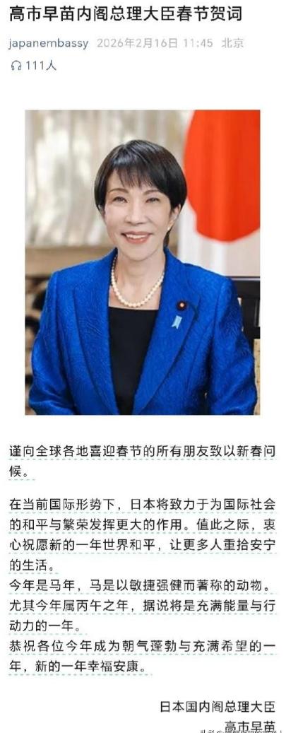 东京塔不再亮红,贺词删光“华侨华人”。高市早苗这手操作,不是失误,是摊牌!日本不仅关了灯,更关上了中日友好的大门。别再幻想,这种故意添堵的行为,就是日本右翼发出的“断交”信号,清算时刻到了! 连续七年的红光被掐灭,除夕夜的东京塔死气沉沉。高市早苗这把“软刀子”,直接扎进了中日关系的肺管子。 石破茂喊过,安倍晋三也没敢漏过,唯独她,把“华侨华人”四个字抠得干干净净。 就拿去年来说,石破茂的春节贺词有388个日文字符,明确提到“向在日本生活工作的华侨华人、全球各地喜迎春节的所有朋友致以新春问候”,还感谢了世界各地对日本能登半岛地震的支援。 可今年高市早苗的贺词,只剩下270个字,篇幅少了三成不说,不仅删掉了“华侨华人”,连“克服分裂与对立”“基于法治的国际秩序”这些过往贺词里的常规表述也一并删除,只留下“为国际社会的和平与繁荣发挥更大的作用”这类空洞无物的套话。 有人或许会替她辩解,这只是无心之失,是文案疏忽。但大家别忘了,高市早苗从来都不是什么温和派,她是出了名的右翼强硬分子,就连日本国内的有识之士,都在抗议她的错误言行。 前不久,日本“继承和发展村山谈话会”在东京举行集会,前首相鸠山由纪夫明确谴责她的涉台错误言论,认为其严重背离《日中联合声明》,是在加剧地区紧张局势;还有不少日本学者指出,高市早苗上台后,一直在推动日本“右转”,一边忽视国内民生难题,一边全力扩充军备,甚至企图修改和平宪法,她的每一步操作,都是在践行右翼势力的主张。 这样一个骨子里就带着对华敌意的政客,怎么可能在春节贺词这种公开场合,犯下“疏忽漏写”的低级错误? 说到底,掐灭东京塔的红光,删除贺词里的“华侨华人”,都是高市早苗精心策划的政治动作,目的就是向外界摊牌——日本右翼已经掌控了国家走向,不再愿意维持中日友好的表面假象。 她心里很清楚,华侨华人是中日文化交流、经济合作的桥梁,删掉这四个字,就是在割裂中日之间的民间联系;东京塔的红光,是中日友好的象征性符号,掐灭这束光,就是在向中国传递对立的信号。 更值得警惕的是,她的这份操作,并不是个人行为,而是日本右翼势力彻底绑架国家机器的体现,从她的涉台言论,到推动强军扩武,再到如今的春节“添堵”,一系列动作都在说明,日本右翼已经不再掩饰自己的野心,中日关系的寒冬,或许才刚刚开始。 我们一直希望中日两国能秉持“一衣带水”的情谊,保持友好相处,毕竟无论是经济合作还是民间交流,友好互利才是双赢。可高市早苗的所作所为,一次次打破我们的幻想,她用最拙劣的方式,给所有中国人泼了一盆冷水,也彻底关上了中日友好的一道重要大门。 这不是所谓的“外交礼节疏忽”,更不是“无心之失”,而是赤裸裸的政治羞辱,是日本右翼发出的“断交”预警。 现在,我们再也不能抱有任何幻想,必须看清现实——日本右翼的野心已经昭然若揭,清算时刻也已经到来。我们不主动挑起对立,但也绝对不会容忍任何国家、任何势力,用这种卑劣的方式践踏我们的情感,损害我们的利益。 或许有人会问,这会不会影响中日之间的正常交流?答案是肯定的,但责任从来不在我们这边。高市早苗的操作,不仅伤害了中国人民的感情,也损害了日本自身的利益——要知道,中国是日本最大的贸易伙伴,中日民间交流的中断,最终受损的还是日本的普通民众和企业。 日本国内的有识之士已经看清了这一点,他们抗议高市早苗的错误言行,担忧国家会被右翼势力带向危险的边缘,这也说明,不是所有日本人都认同右翼的主张,中日友好的根基,从来都在民间。 但我们必须清醒,友好是相互的,单方面的付出和幻想,换不来真正的尊重。高市早苗的摊牌,虽然让人愤怒,但也让我们彻底看清了日本右翼的真面目,这未必是坏事——至少我们不用再自欺欺人,不用再对那些虚假的友好抱有期待,而是能集中精力,做好自己的事,守护好自己的利益。 东京塔的红光可以被掐灭,但中日民间的情谊,不会因为一个右翼政客的操作就彻底消失;日本右翼可以发出对立的信号,但他们永远无法阻挡中日两国人民追求友好的愿望。 只是从现在起,我们要放下幻想,直面现实,对于任何故意添堵、挑衅的行为,我们都要坚决反击,用实力告诉对方,中国从来都不是可以随意拿捏的软柿子。 信息来源:1. 人民日报《日本有识之士抗议高市早苗错误言行》;2. 广州日报《高市早苗,很疯很飘》;