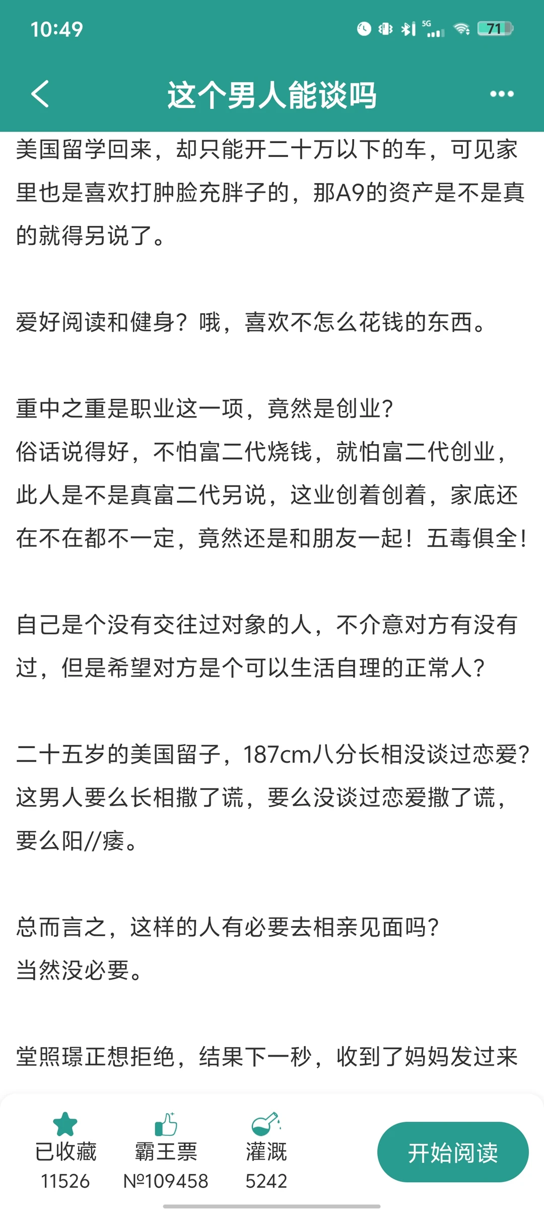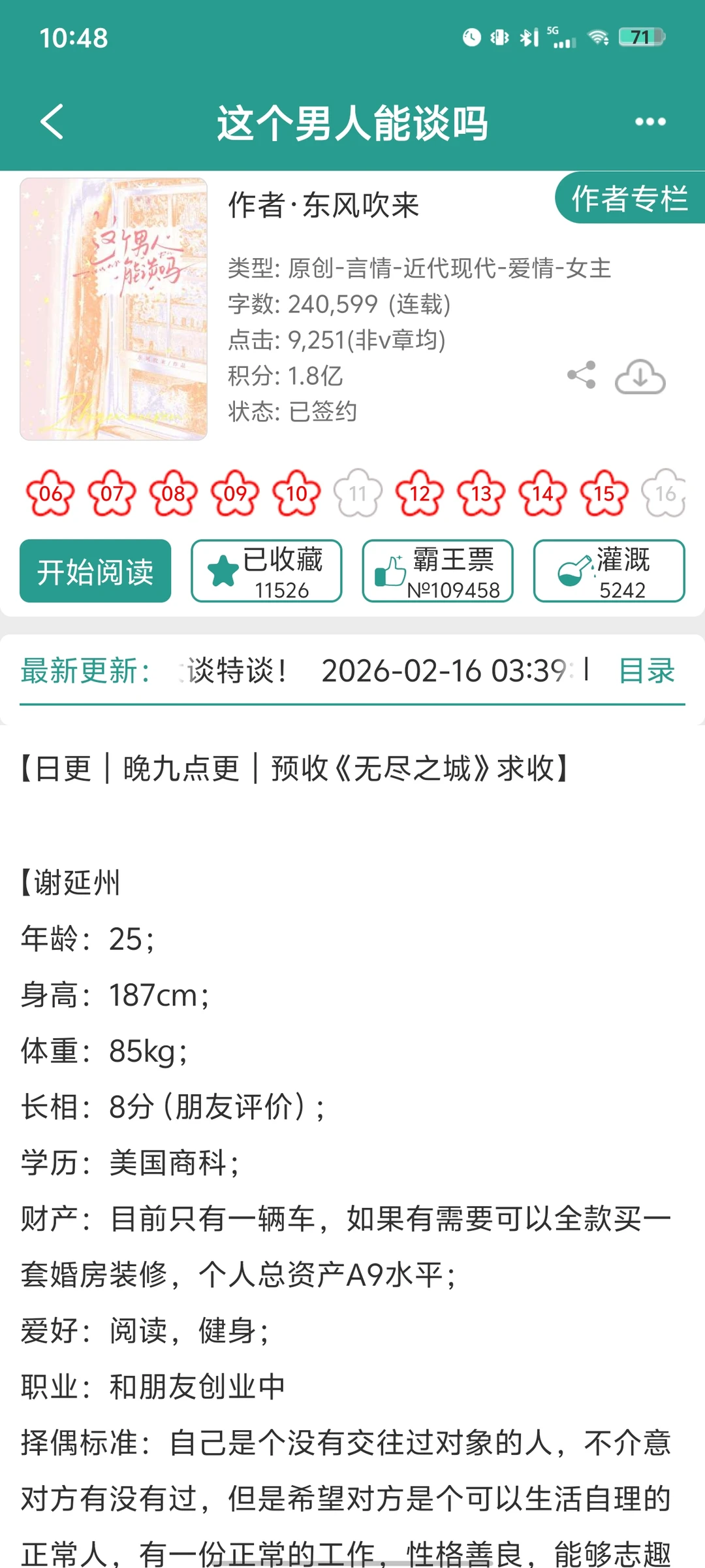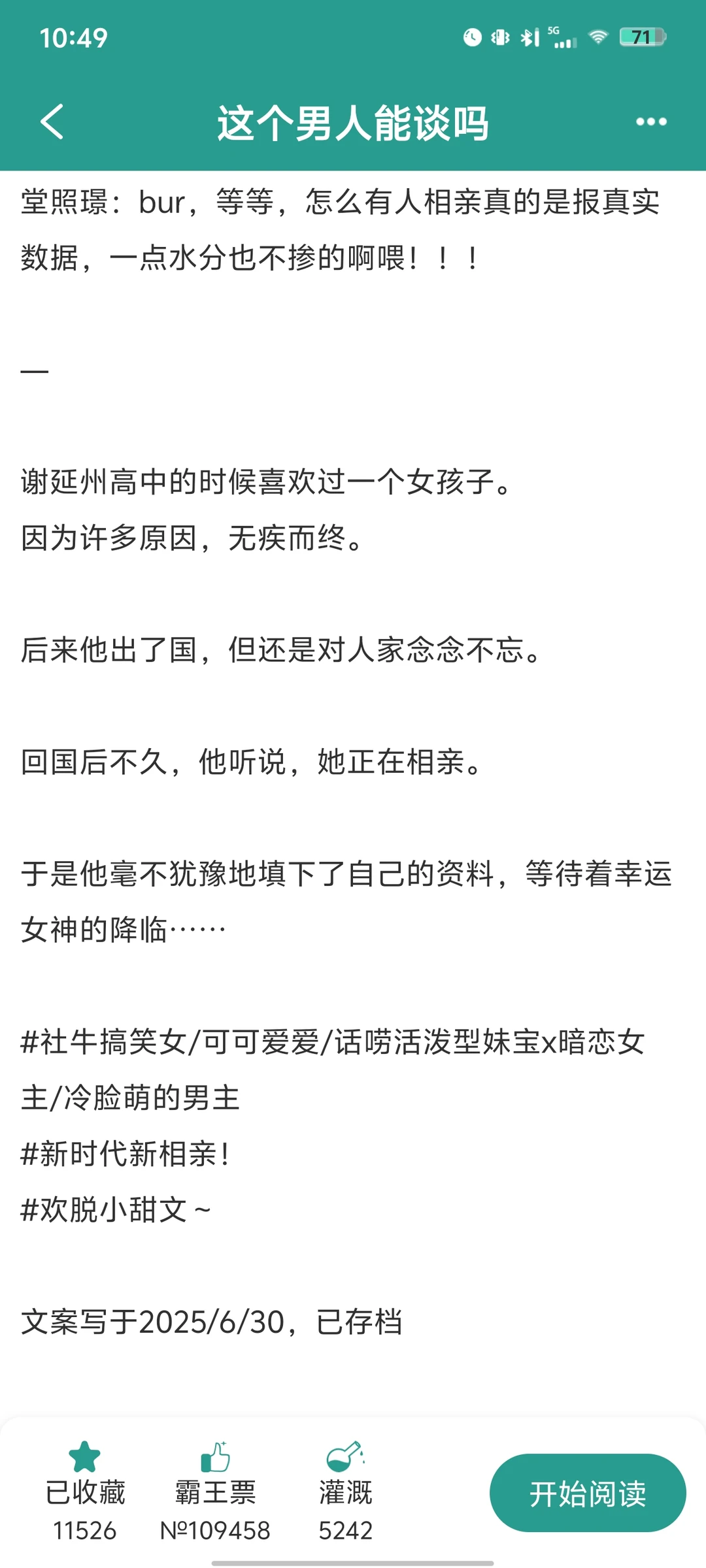 《这个男人能谈吗》by东风吹来 正在连载的小说,有60多章了 [种草R]这本男主和女主真的都很可爱哈哈! 女主从一开始的怀疑男主到后面逐渐打脸,过程真的太搞笑了! [郁金香R]相亲部分的内容虽然有一部分夸张,但也可以说是很真实了,尤其是女主对相亲对象的解读 现在世界纷纷扰扰,信息干扰真的太多了,大家都要注意判断什么是真什么是假呀!