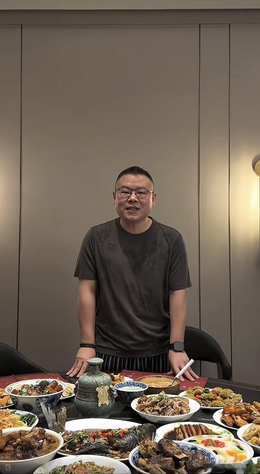 桌子上摆了好多菜品,不只是岳云鹏喜欢吃的河南菜了,更多是大家都喜欢吃的,有大闸蟹、鱼,其中那一瓶白酒格外引人关注。