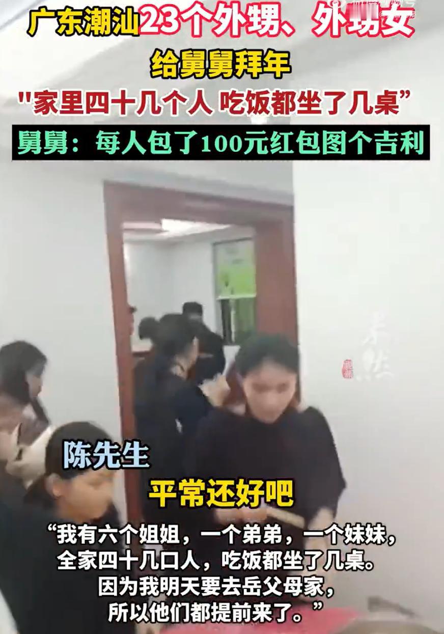 幸亏是在广东!广东潮汕,一位舅舅火了,家里浩浩荡荡来了23个外甥和外甥女给他拜年,从门口排到客厅,拜年声此起彼伏,场面堪比小型幼儿园开学,舅舅自然不能让他们空手而归,每个人准备了100块的红包。网友:这是从小“集万千宠爱于一身”的舅舅 陈先生有六个姐姐,一个弟弟,一个妹妹。全家老小加起来四十多口人,过年吃个饭得摆好几桌。这种家族规模在潮汕地区不算稀奇,但在外人看来确实够震撼 孩子们知道舅舅第二天要去岳父母家,特意赶在初一这天来拜年。一大早,孩子们就陆续登门,大的十几岁,小的还抱在怀里。进门就是齐刷刷的新年好,喊得陈先生心里美滋滋的 广东人发红包讲究意头,不看重金额大小。陈先生给每个孩子准备了100块,图个百事顺遂的好彩头。发红包的时候,孩子们排着队领,场面热闹得像在发年终奖。有调皮的外甥还开玩笑说,舅舅这是从小集万千宠爱于一身,现在该还债了 说实话,这种场景在北方可能不太常见。要是在北方,23个外甥拜年,可能三个月都白干了。但在广东,大家更看重的是这份热闹和团圆。陈先生说,看着满屋子的孩子,那种温馨感才是真正的年味 这事登上热搜后,引起了不少网友讨论,有人算账说23个红包就是2300块,这舅舅当得够大方。也有人羡慕这种大家庭的热闹,说现在都是小家庭,过年冷冷清清的 其实仔细想想,陈先生这种大家庭在广东还真不少见。潮汕地区向来重视家族观念,兄弟姐妹多,亲戚走动勤。逢年过节,几代人聚在一起,虽然忙点累点,但那份亲情是实打实的 过年发红包只是个形式,真正暖心的是这份牵挂和惦记。就像陈先生说的,看到孩子们热热闹闹地来,感觉特别有年味。这种朴实的情感,才是春节最该有的样子