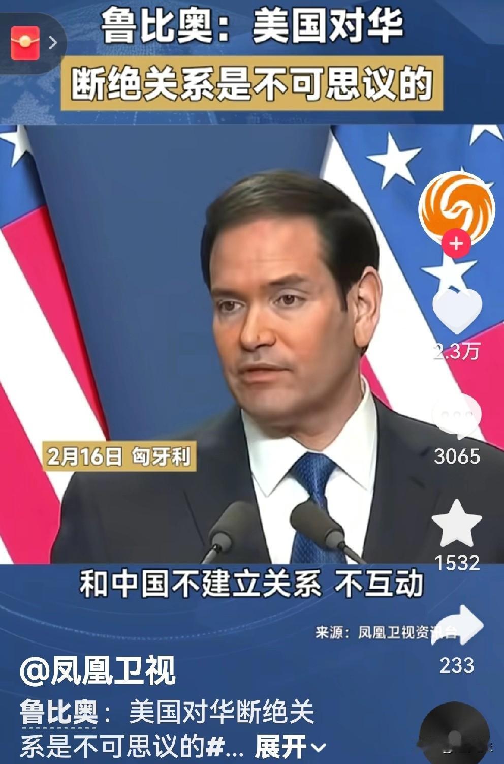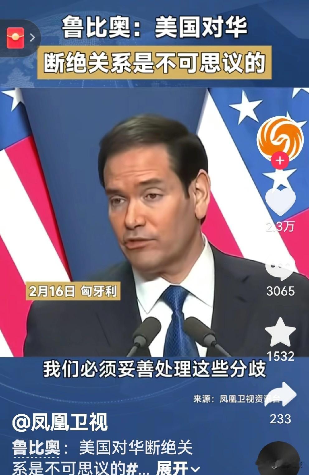 美国对华断绝关系,不可思议! 现实不会说谎,实力就是外交。 鲁比奥16号在中国人欢度除夕之夜,于匈牙利再次强调中国是一个大国,是世界第二大经济体,还是核大国,如果不建立双边关系和贸易往来,不可思议。 从做参议员时疯狂抹黑中国的反华人物到今天能处处讲与中国搞好关系,确实让人感觉到不可思议,其实也很好理解,嘴炮代替不了务实合作带来的稳定影响,世界上的两个最大国家最强国家,只有管控分歧,才能让全世界人民觉得未来可期,中美关系行稳致远。 谢谢他给我们送来的拜年祝福。