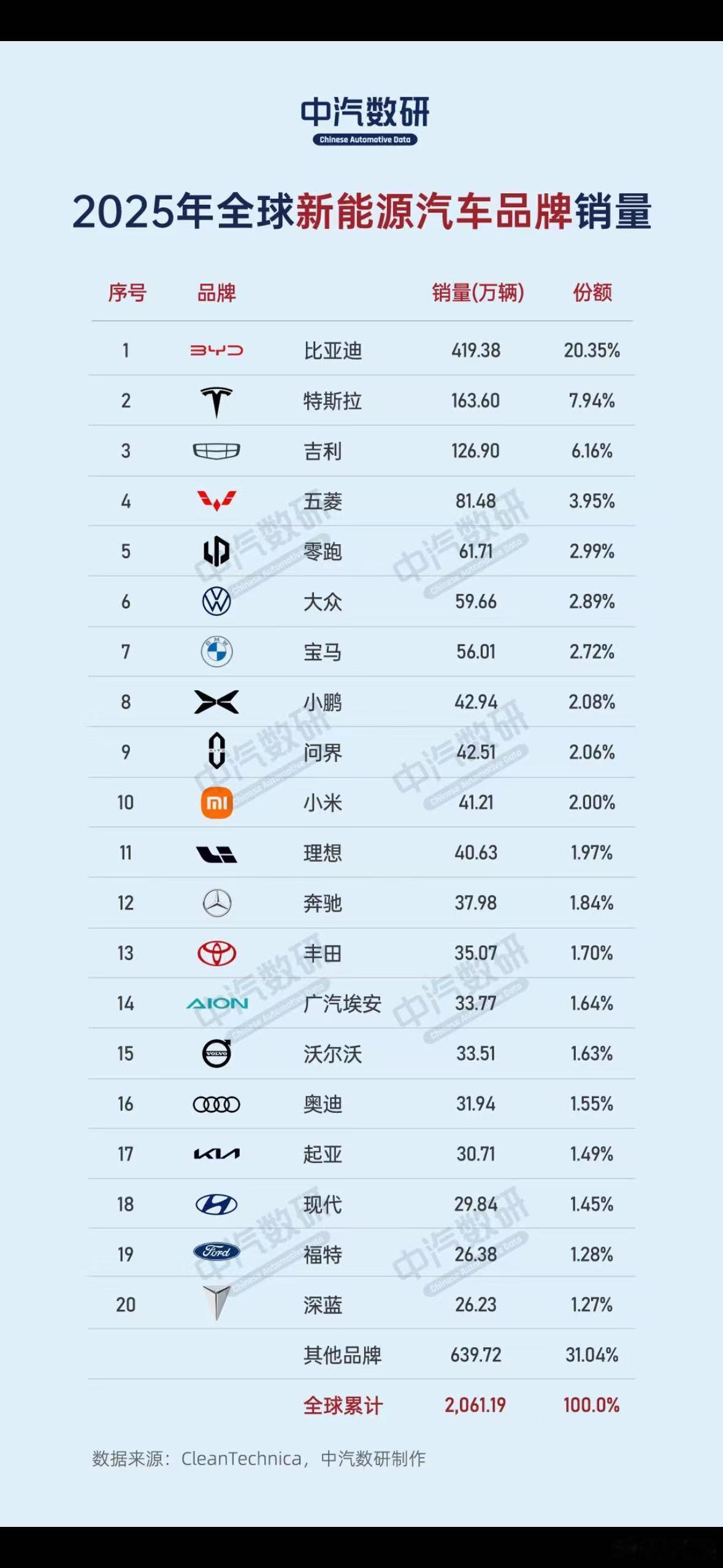 全球新能源销量排名(只计新能源,不计油车),中国市场以及中国品牌依然是绝对的大头