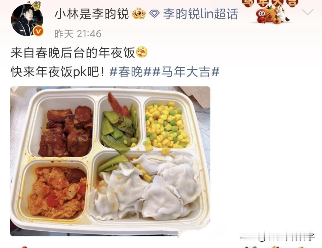来自春晚后台的年夜饭,荤素搭配,还有热腾腾的饺子! 一直都挺好奇,明星们登上央视春晚舞台表演,不能与家人团聚,能不能吃上年夜饭,会不会特别丰盛,这下总算知道了。 演员李昀锐在社交平台发文,并分享了春晚后台的年夜饭,不能说特别的丰盛,跟家里的肯定没法比,不过,也算荤素搭配,排骨、豆角、木须柿子,玉米粒、还有热腾腾的饺子。 其实,别的都不重要,大年三十,肯定要吃饺子,代表浓浓的年味,只不过,这个量,能吃饱吗?可能艺人都很自律,饭量小吧! 另外,本以为明星在春晚后台等候出场的时候,估计会很孤单。 看到王玉雯晒出的合影,貌似也挺热闹,大家都比较熟悉,一起唠唠嗑,时间很快就过去了。 话说,每个地方的习俗不同,或许年夜饭吃的也不一样吧!