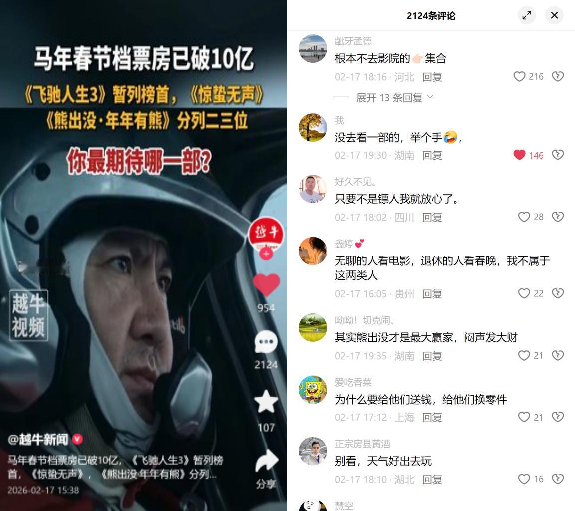 春节档破10亿,观众却喊不看? 2026马年春节档票房刚破10亿,《飞驰人生3》登顶,《熊出没》闷声发大财排第三。 可网上全是吐槽:有人嫌票价贵,有人直接说只要不是镖人我就放心了。 算笔账就懂,一家三口看场电影得300多。 这钱够涮顿热乎火锅,或是带娃去游乐园疯一天,都是摸得着的快乐,不比赌电影靠谱? 至于《镖人》,原著动画评分那么高,真人版却闹换角、有演员争议,选角还不贴原著。 再想想去年武侠片春节档扑得有多惨,谁愿意拿辛苦钱赌黑马? 不如选《熊出没》,每年稳如老狗,闭着眼都不踩雷。 官方的喜报全是数字,可普通人的生活全看性价比。 谁都想浪漫一把,但这年头求稳才最重要,把钱花在刀刃上才踏实。 你今年春节档掏钱包了吗?