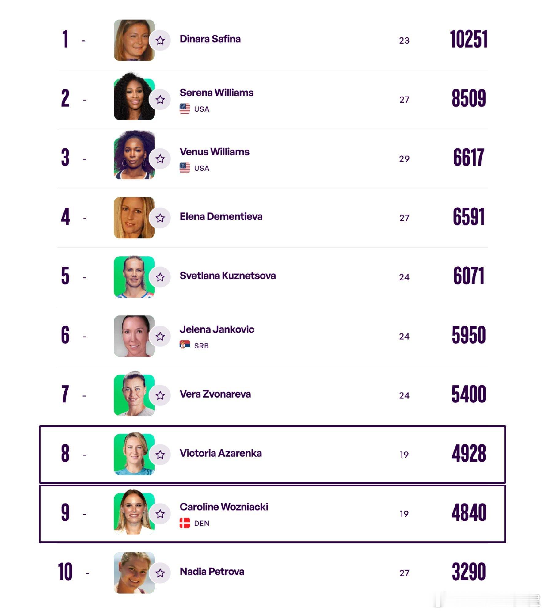 17年来第一次将有两位U20球员排名女单TOP10,看看2009年的TOP10,你们都认识吗?这很澳网