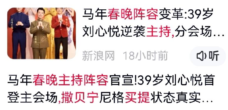 怎么看央视春晚主持人阵容曝光,新老搭配引发热议! 任鲁豫、撒贝宁、尼克买提三位男主持默契十足,尤其是任鲁豫,全程沉稳大气,主持词信手拈来,展现出挑大梁的实力。 最令人惊喜的是首次登上春晚舞台的刘心悦。39岁的她比龙洋还大两岁,却少女感十足,嗓音清亮、台风稳健,被观众称赞有董卿接班人的风范。 这位来自辽宁卫视的主持人曾连续六年主持辽视春晚,2023年参加央视主持人大赛获得银奖,应变能力获得康辉认可。今年春晚虽然出场不多,但她沉稳大方的表现已让人印象深刻。 鲜为人知的是,作为家中独女,刘心悦曾为救治重病父亲坚持不放弃,最终创造奇迹让父亲康复。春晚结束后,她第一时间赶回家与父母团圆,让人倍感温暖。 另外,龙洋因眼神上飘被指看提词器,不过也有观众表示现场并无提词器;马凡舒则端庄沉稳,颇有周涛风范。 撒贝宁继续担任搞笑担当,任鲁豫沉稳内敛不输前辈。长江后浪推前浪,主持人队伍的新老交替正在稳步推进。 对此你怎么看?