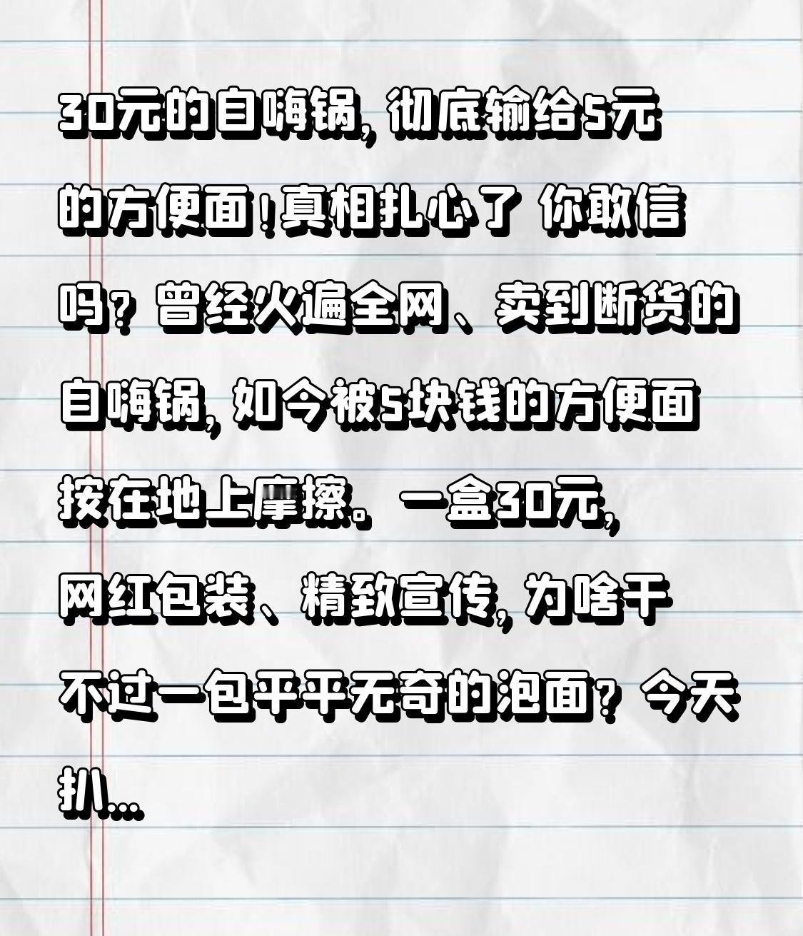 30元的自嗨锅,彻底输给5元的方便面!真相扎心了 你敢信吗?曾经火遍全网、卖到断货的自嗨锅,如今被5块钱的方便面按在地上摩擦。一盒30元,网红包装、精致宣传,为啥干不过一包平平无奇的泡面?今天扒开真相,越看越清醒。 前几年,自嗨锅简直是网红顶流。不用火、不用电,加冷水15分钟就能吃,主打一人食、仪式感。加班、追剧、出差、旅游,人手一盒,发朋友圈倍有面子。资本疯狂砸钱,明星代言、直播带货,估值一度冲到75亿,所有人都觉得:速食新时代来了。 可转折来得太快。尝过新鲜劲,大家慢慢回过味:这东西,真不值30块!盒子大得吓人,打开全是空气。几片冻干菜、一点点粉条,所谓的牛肉少得可怜,口感又咸又腻,吃完还不饱。操作麻烦、等待久,发热包有危险,高铁还不让带,花高价买麻烦,谁愿意当冤大头? 再看5元方便面,开水一泡,3分钟开吃,分量足、味道稳,吃饱喝足不过几块钱。没有花哨营销,没有网红光环,却用几十年的口碑,守住了打工人的底线。 这不是口味的较量,是消费观的觉醒。以前我们追网红、买噱头,为包装和营销买单;现在大家越来越务实,不被套路、不被收割,只选实在、靠谱、性价比高的东西。自嗨锅输的不是价格,是诚意;赢的不是创新,是套路。 生活终究要回归朴素。最贵的不一定最好,最火的不一定长久。真正能留住人的,从来不是华丽外表,而是真心实意的品质。 愿我们都能擦亮眼睛,不被浮躁迷惑,不被消费绑架。吃得踏实,过得安心,把钱花在刀刃上,把日子过成自己喜欢的样子。