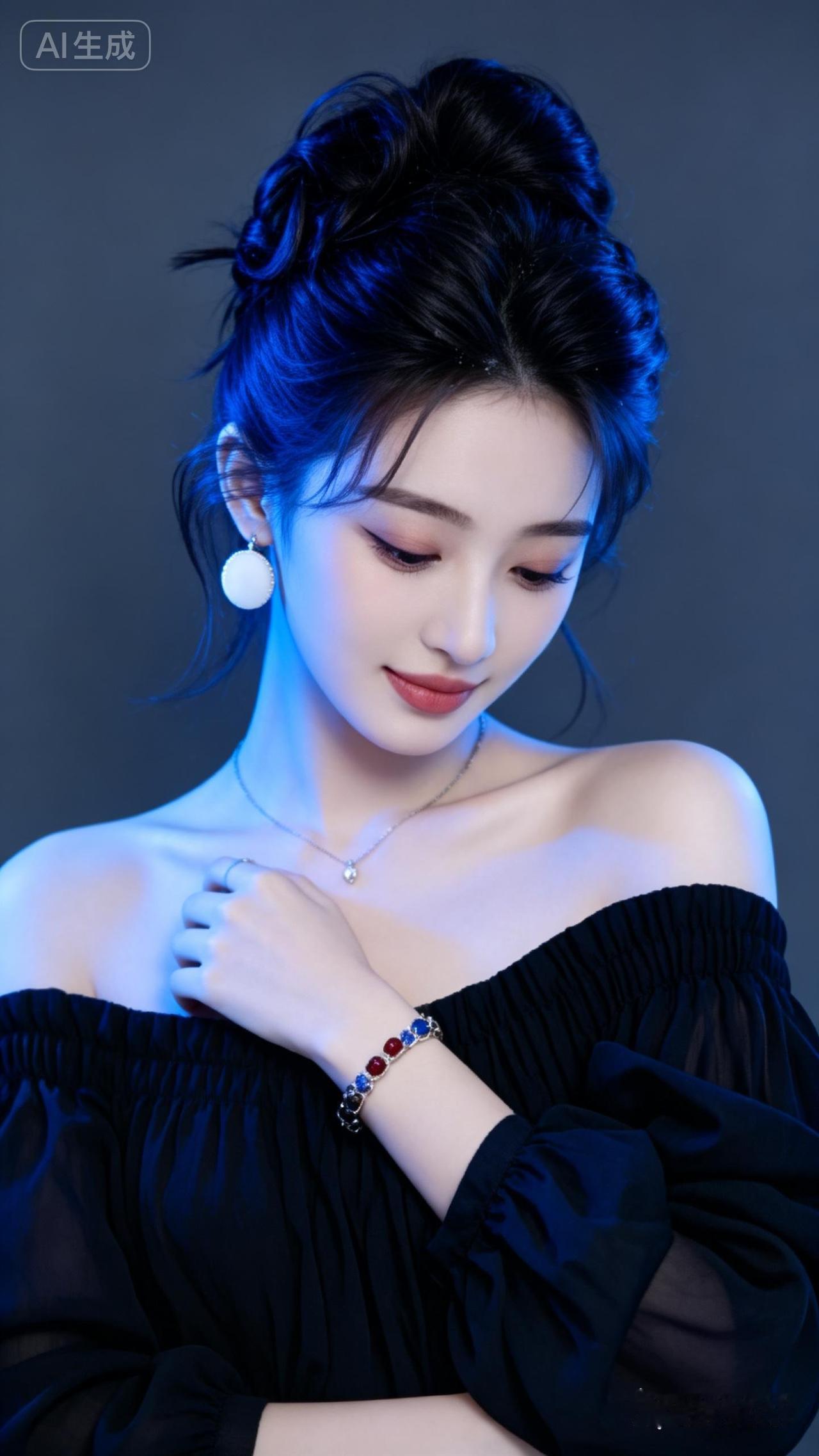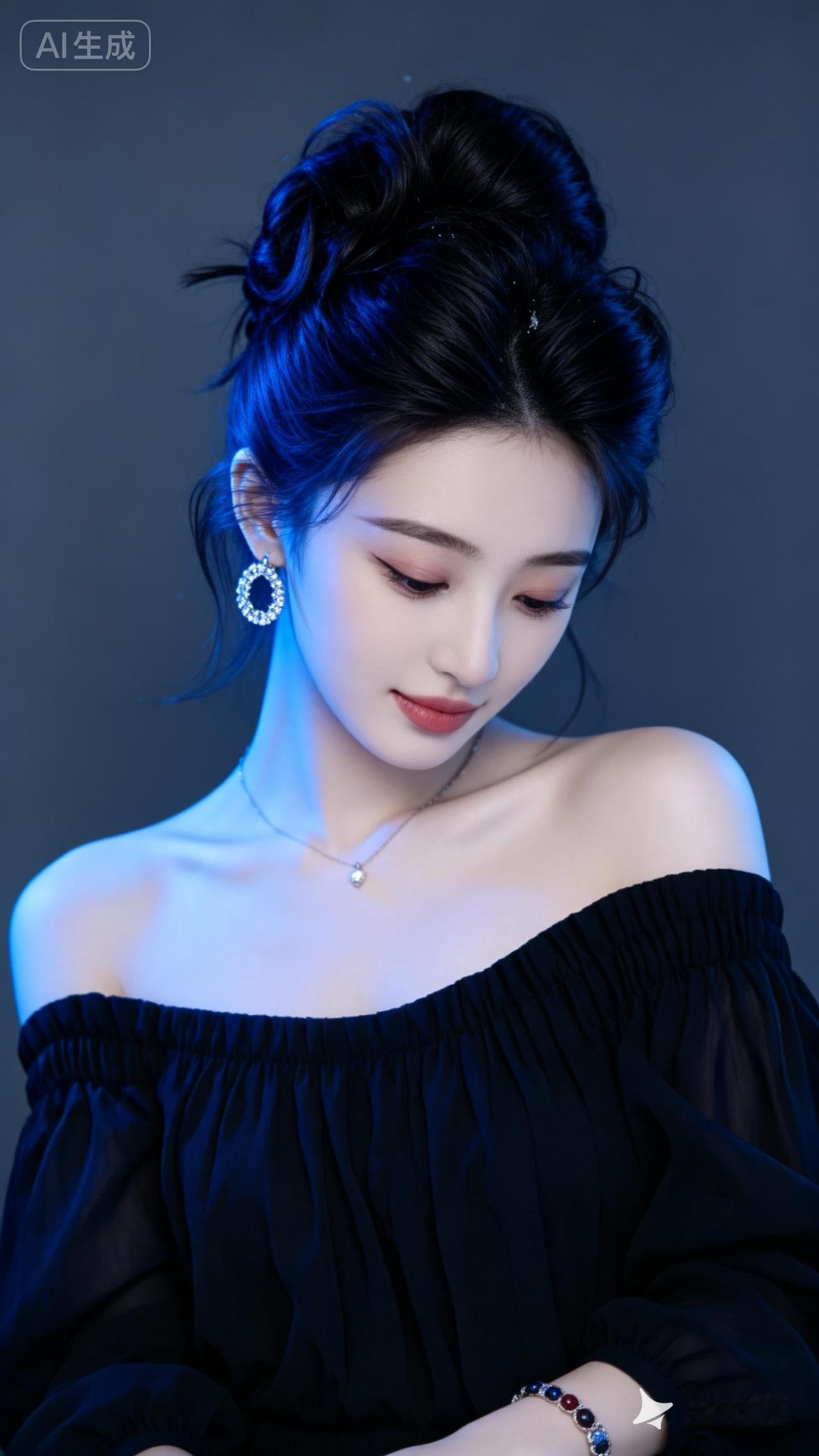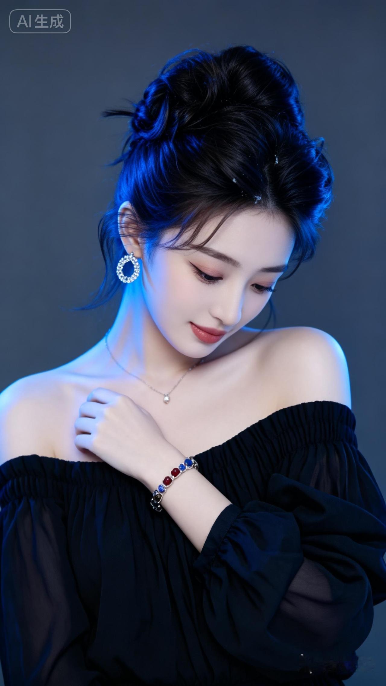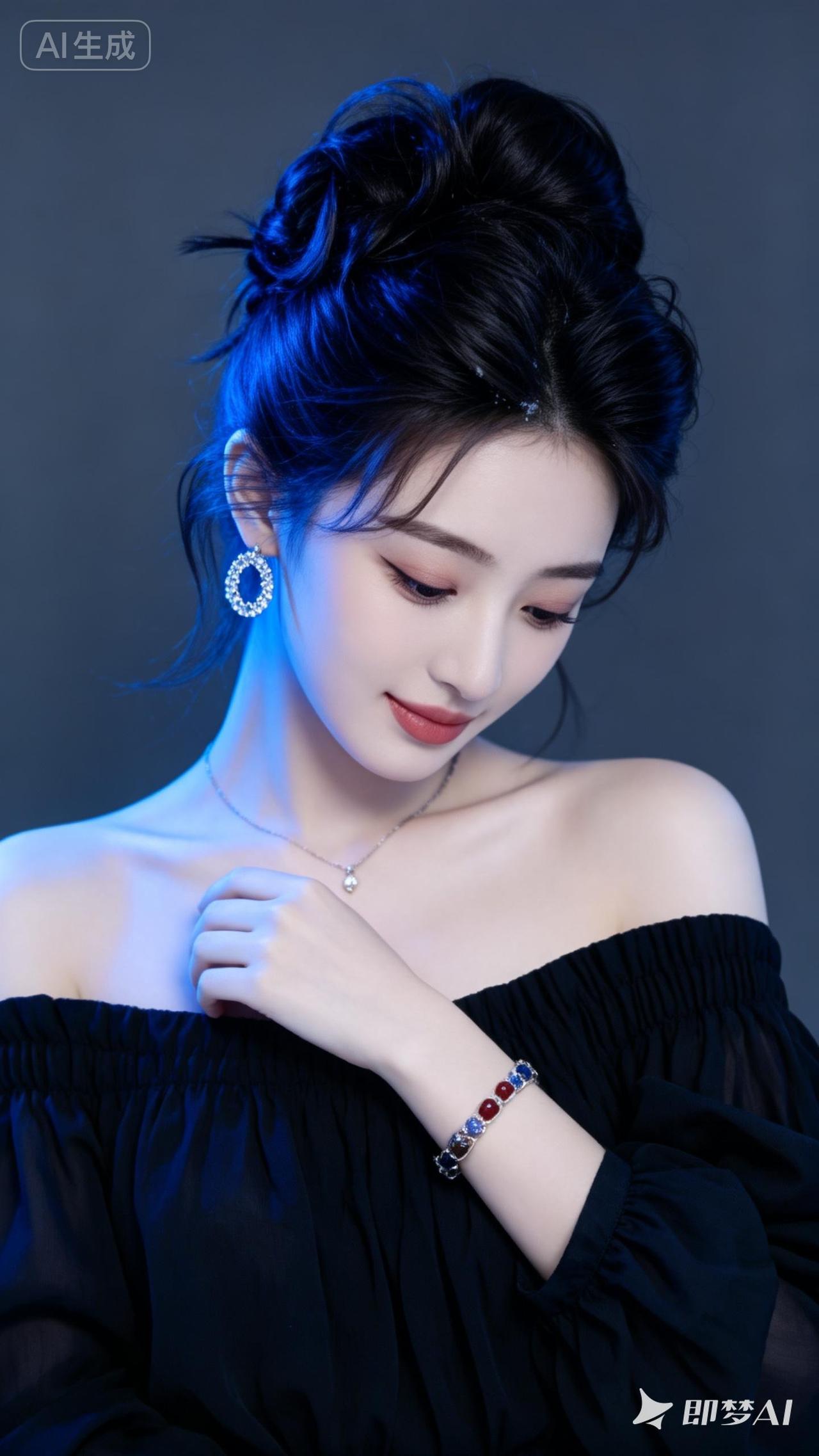 年轻漂亮的美女,时尚黑色棉麻一字肩雪纺衫,戴着耳环和项链,优雅气质,精致妆容,八零年代蓬松盘发。
