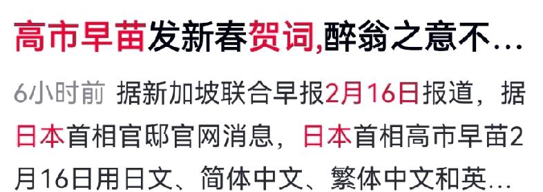 2月16日,日本首相高市早苗用中文发表新年贺词,并同步推出日文、繁体中文、英文版本。 用中文拜年,向中国示好的意图明显,表达了对话意愿。但能否获得中方积极回应,目前仍是未知数。 贺词中,她提到希望世界和平,日本愿为此推动和平进程。今年是马年,她祝愿大家新春幸福安康。 同时,她还喊话俄乌、伊朗、格陵兰岛等冲突地区,表示愿提供帮助,但未提具体内容。此举是否会惹恼美国,值得关注——毕竟美国在这些问题上进展不顺,而高市早苗计划3月访美,任何向中方的倾斜都可能影响这次行程。 日本此时示好,背后是经济困境的紧迫压力。日本GDP增长低于预期,旅游业因中国游客锐减遭受重创。此前,高市早苗虽多次喊话中国,但因未对错误言论道歉或收回,始终未获积极回应,中日关系持续冷淡。 如今,日本民众已等不及了,多次游行示威要求改善对华关系,推动地方交流恢复。再拖下去,2026年日本经济只会更被动。高市早苗的“新年问候”,究竟是真缓和,还是权宜之计,还得看下一步行动。 对此你怎么看?