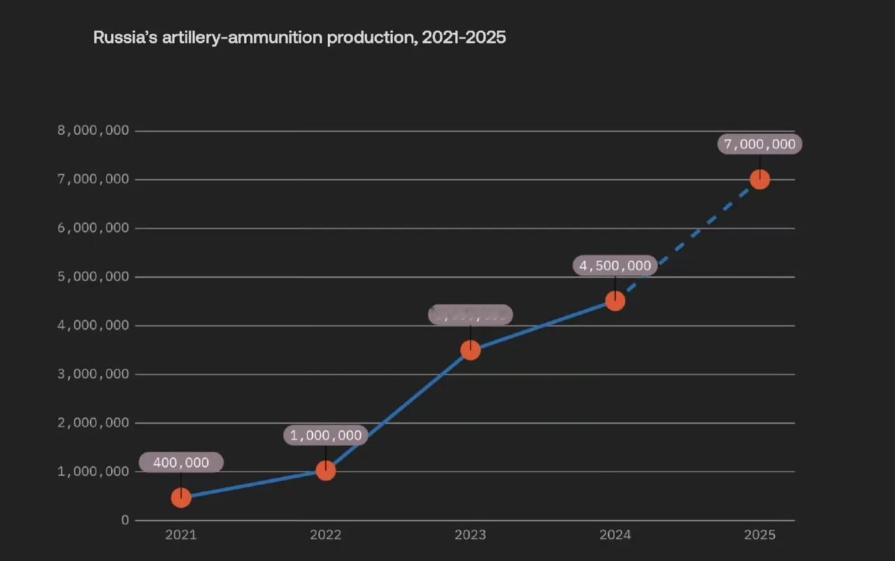 俄罗斯在2025年生产了700万发炮弹,稳居世界第一,远远超过中国。俄罗斯现在是