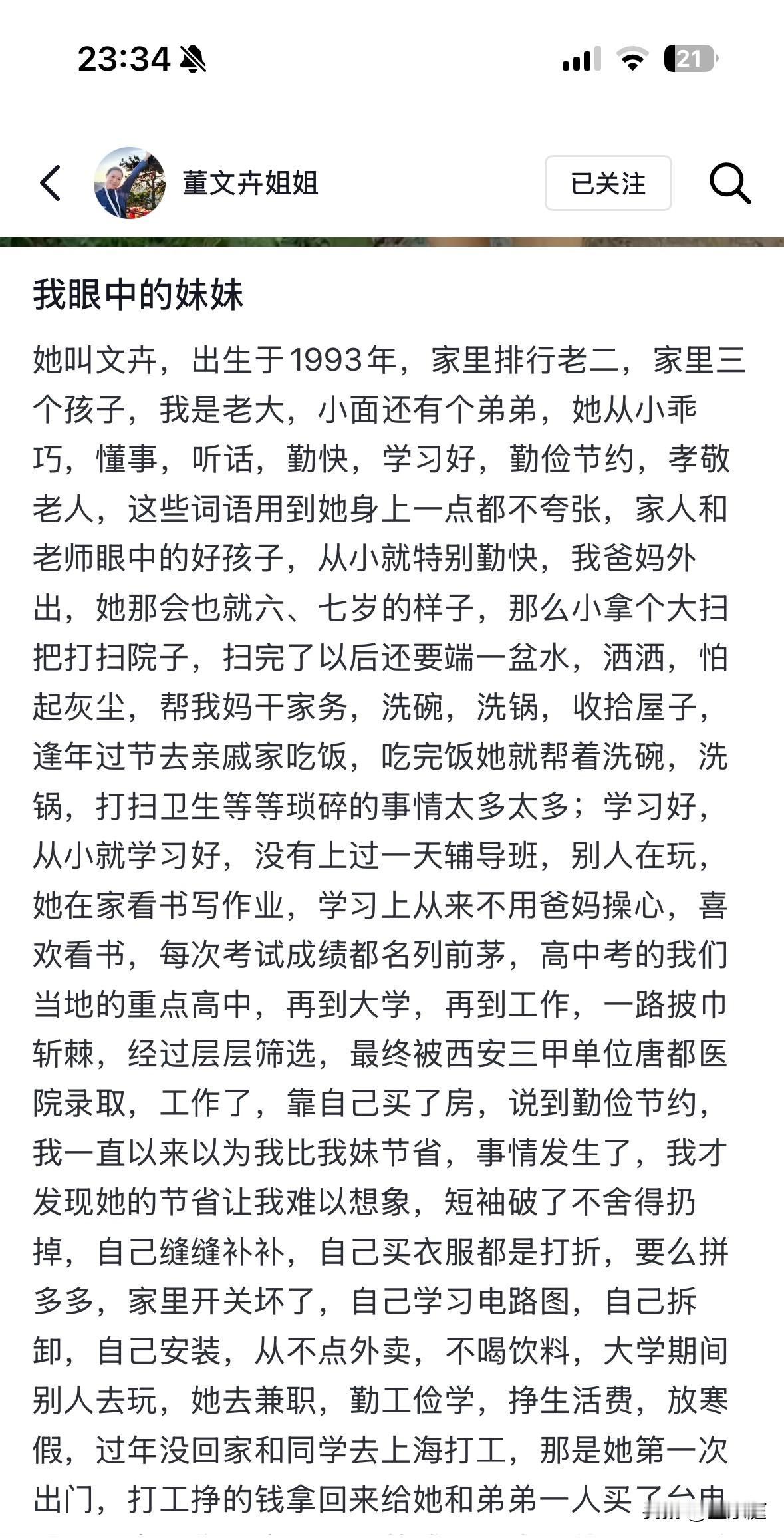 这是被同居男友杀害的女护士董文卉生前的一些记录,她非常热爱生活,几乎每隔一两天就会发布九宫格的照片。 她把自己的生活安排的井井有条,上班之余,还考了好几个证书。 她对待自己很勤俭,作为一家三甲医院的女护士,她月收入颇丰。可她为了省下开支,无论多累,都坚持自己做饭吃。生活上,她非常会打算,从不买价格高昂的电子产品,买给自己最贵的东西是一条三千元的项链。 日常生活里,她连一件短袖穿破了都舍不得丢,缝缝补补就又穿在了身上。 很多人不理解,她年纪轻轻为什么就有钱买房子,缘由很有可能就在此处。 她虽然严格要求自己,但是对家人却非常大方!无论是父母、姐姐,还是弟弟弟媳和她的关系都非常好。 她从小就善良懂事,非常懂得体贴家人。平时在医院的工作不算轻松,可一回到家就会主动帮忙照顾瘫痪在床的奶奶,并且从不抱怨,一直尽心尽力照顾着老人。 然而,这么好的一个女孩,却因一段很不合适的感情让生命走到了尽头! 师佳豪,结婚短短两年时间就抱上了两个儿子。按道理来说,他应该尽到自己应有的责任。可认识董文卉后,他便离了婚,还把养儿子的责任也丢给了父母…… 董文卉和师佳豪几年的感情里,二人分分合合了多次。董文卉数次想分手,奈何一直未能如愿。 她把自己的心灵历程都悄悄记在了日记里,把那些被打的伤痕累累的照片也都存了起来。但在朋友圈里,她依然笑对人生。在不知情的亲朋好友和网友眼中,她给人的感觉始终就是一个元气满满、阳光明媚的女子! 师佳豪的所作所为终究是害人害己,因为除了董家人,他自己的家人也因他的不理智陷入了困境之中! 很多时候放过他人,便是放过自己!只可惜,师佳豪压根就不明白这个道理。 真正的爱是成全!爱就该好好的在一起,如若不爱了,大大方方离开才是体面![祈祷]
