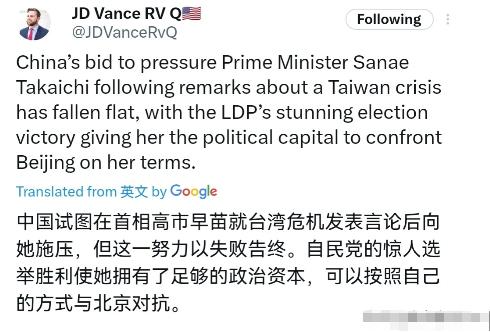 美国副总统万斯表示,中国试图就高市早苗首相有关台湾危机的言论向其施压,但并未奏效。自民党此次大获全胜的选举胜利,让她获得了按自己意愿对抗北京的政治资本。很显然,在万斯看来,高市早苗的当选对于我们的反制措施是一个“挫败”,并认为高市早苗现在有了非常强的资本跟中国对抗。 高市早苗领导的自民党在此次日本众议院选举中拿下316个议席,联合维新会组成的执政联盟共斩获352席,创下战后单一政党在众议院的最好成绩。这场压倒性胜利让她进一步巩固政治地位,也让她更敢于推进既定的强硬对华路线。 她此前就多次宣称“台湾有事就是日本存亡危机”,甚至暗示自卫队可行使集体自卫权,这种触碰中国主权红线的言论从未真正撤回。 万斯的相关表述完全无视中方核心关切,他口中的“施压未奏效”不过是美国的片面解读。事实上高市早苗的所谓“政治资本”,背后离不开美国的默许与支持。 高市早苗推动提前修订三份安保文件,计划将防卫预算提升至GDP的2%以上,还频繁与美、澳、菲举行联合军演,这些动作都精准契合美国的“印太战略”。 美国显然将高市早苗视为可利用的战略工具,特朗普政府嘴上说着中美关系良好,实际行动却暴露遏制中国的真实意图。美国并不在意日本是否会因此陷入与中国的对立,反而乐于看到日本在台海问题上不断挑衅,以此消耗中国的战略精力。这种借他人之手牵制竞争对手的做法,早已是美国对外战略的惯用伎俩。 高市早苗试图玩“两面手法”,一边对中国抛出“战略互惠”的表述,一边却转头对其他国家放出狠话,这种政治博弈根本瞒不过中方眼睛。 她口中的“保持沟通”缺乏基本诚意,毕竟没有哪个国家会接受“一边挑衅一边谈合作”的荒谬逻辑。中国连续多年是日本最大贸易伙伴,2025年双边贸易额超3000亿美元,但这并不意味着中国会容忍日方在核心利益问题上的一再越界。 中方的反制措施早已精准落地,暂停部分日本水产品进口、收紧稀土和半导体材料出口,这些举措直接击中日本产业链的薄弱环节,不少日本企业已感受到切实压力。 高市早苗的胜选并没有改变中日关系的基本逻辑,也没有削弱中国维护国家主权的决心。中国外交部多次强调,中国人民维护国家核心利益的决心坚定不移,反击各种反华势力挑衅的决心坚定不移。 万斯刻意渲染“中国挫败”的论调,本质上是为了给日本右翼打气,同时掩盖美国干涉地区事务的真实目的。 台海问题是中国内政,任何外部势力都无权干涉,日本极右翼势力若误判形势恣意妄为,必将遭到国际社会的迎头痛击。高市早苗的政治资本建立在挑衅中国主权的基础上,这种资本越膨胀,对中日关系的伤害就越深。 中国的持续施压不是为了挑起对抗,而是为了捍卫国家主权和领土完整,维护战后国际秩序。 中方始终愿意在相互尊重的基础上发展中日关系,但前提是日方必须拿出实际行动,纠正错误言论,恪守政治承诺。美国想把日本打造成遏制中国的“棋子”,高市早苗想借美国支持实现自身政治野心,这种相互利用的关系终究经不起现实考验。 国际社会看得很清楚,谁在破坏地区和平稳定,谁在坚守公道正义。中国的反制措施会根据日方的行动动态调整,任何试图分裂中国领土、干涉中国内政的行为,都将付出应有的代价。 高市早苗的胜选改变不了台湾是中国领土不可分割的一部分这一事实,美国的战略算计也阻挡不了中国统一的历史进程。中方的持续施压,既是对挑衅者的警告,也是对地区和平稳定的守护。