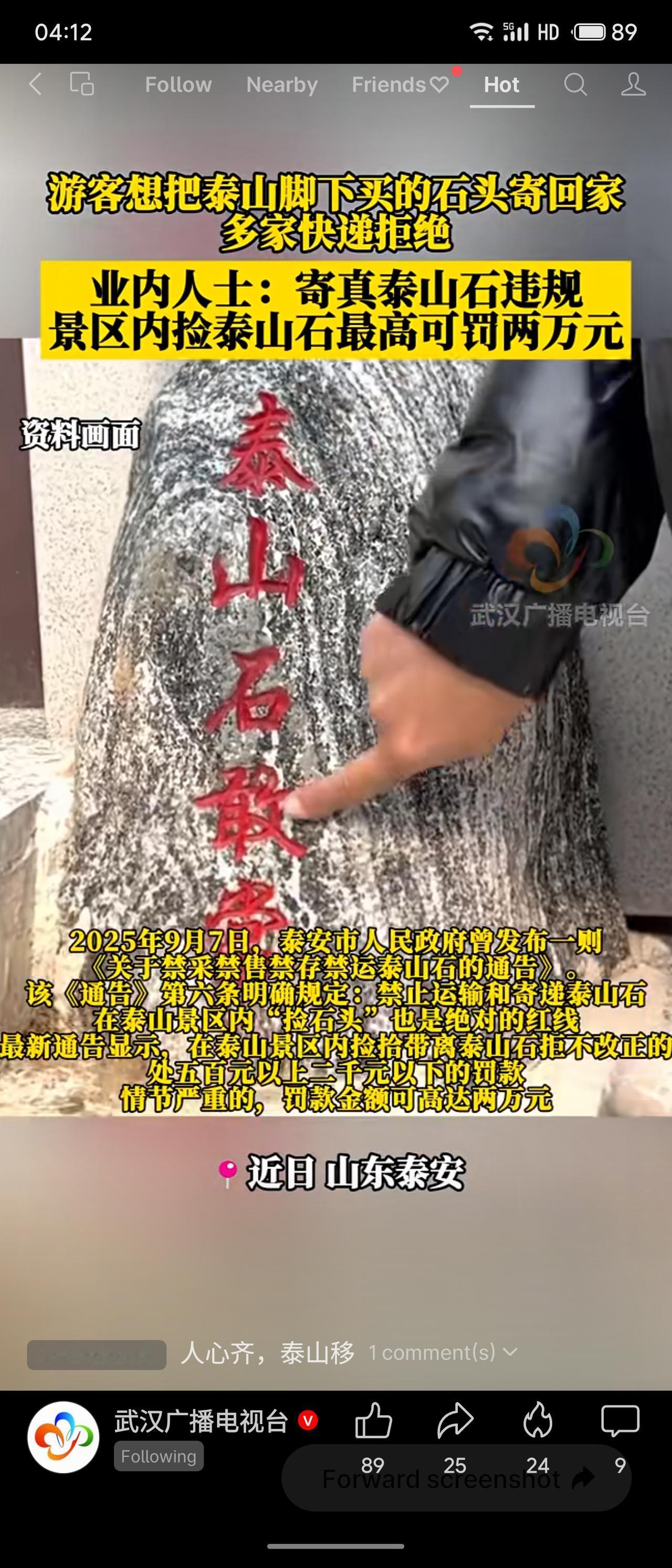 元旦期间,有游客在泰山脚底购买刻有“泰山石敢当”字样的观赏石,商家虽明确此为工艺品,但游客通过顺丰、京东、邮政寄回时均被拒收。快递方表示,泰安地区石头属于禁寄物品。根据2024年9月泰安市政府通告,当地实行泰山石禁采、禁售、禁运,景区捡拾带离最高可罚两万元。此举旨在保护泰山地貌,杜绝滥采乱挖,彰显了严格的环保执行力。