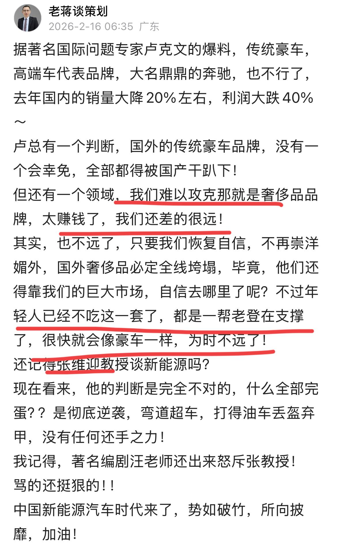 国外的豪车品牌在中国市场彻底完蛋了! 被我们的新能源汽车品牌打得丢盔弃甲,满地找牙!就连一向非常坚挺的奔驰也快扛不住了~但国际问题专家卢克文说,还有一个领域我们没有搞定,那就是奢侈品! LV,爱马仕在我们这里大赚一笔,国内的品牌完全无法与之抗衡!! 老蒋认为,国外顶级奢侈品崩塌为时不远~ 现在什么豪车品牌,顶级奢侈品品牌,都是靠中国的这帮老登在支撑着,那个高端白酒不就是嘛,也快了~ 确实。年轻人已经不吃这一套,已经彻底觉醒,他们比那帮老登更加自信了!! 大国崛起,所向披靡,势如破竹,民族品牌必将崛起,加油!