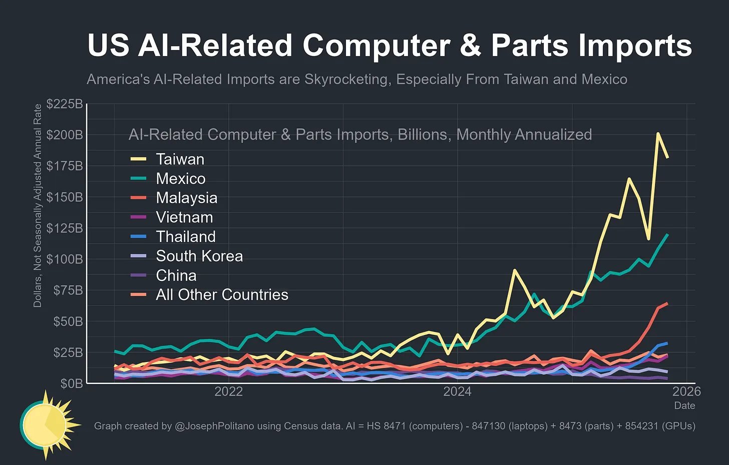 这些硬件产品主要来自海外供应链,美国本土制造能力很有限。正因为免除关税,使得这些高性能机器和部件的进口成本显著降低,帮助美国科技公司大规模扩张AI 计算能力。